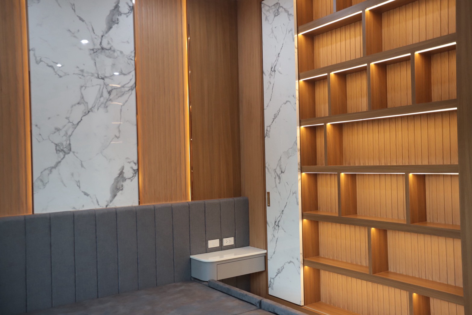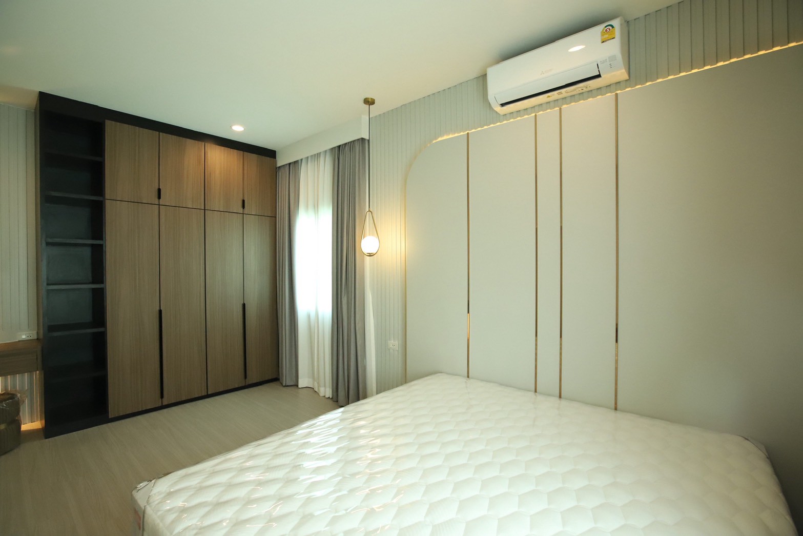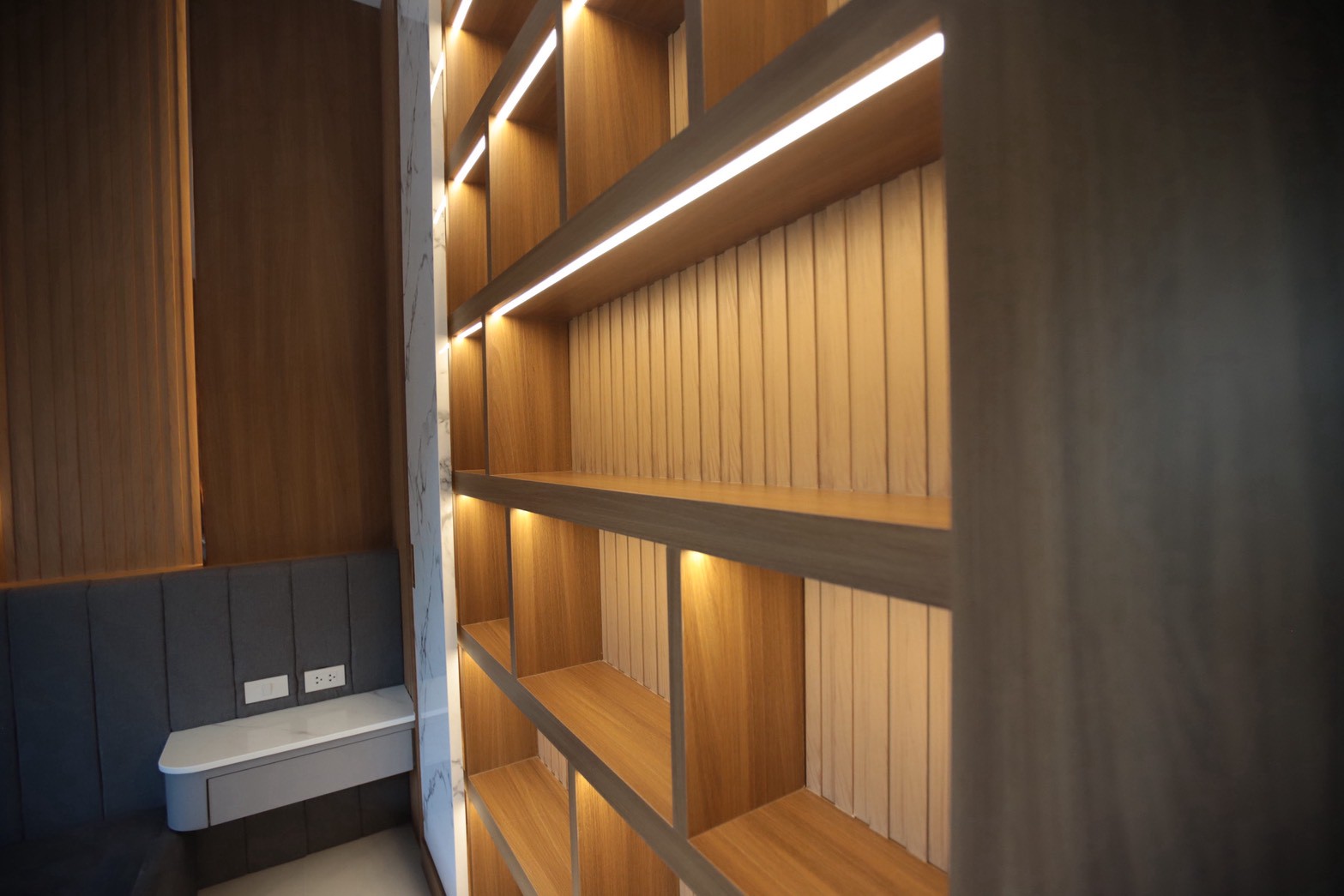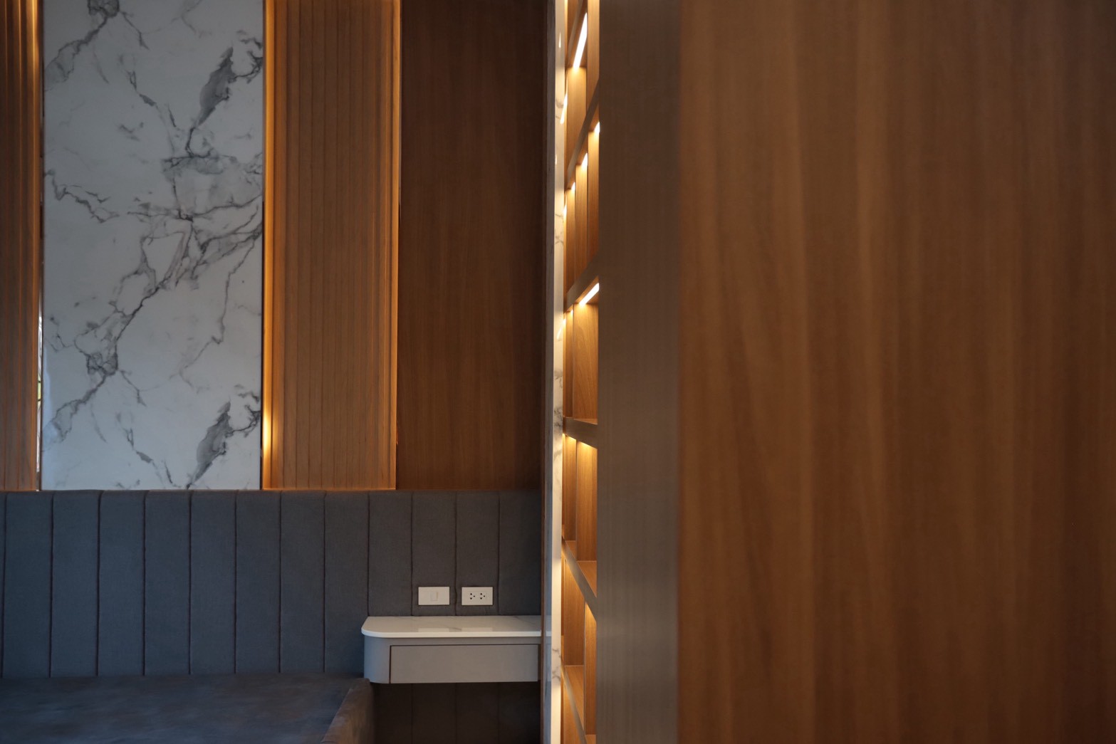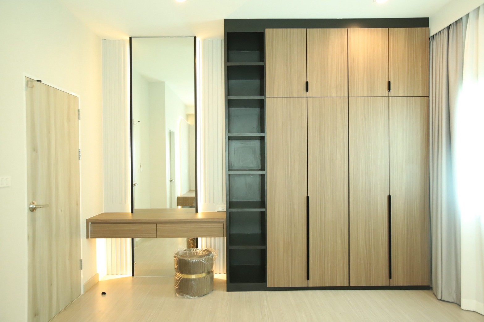 เฟอร์นิเจอร์บิวท์อินภายในบ้านเลือกใช้อุปกรณ์ระบบ Soft Close สำหรับลิ้นชักและบานพับ พร้อมติดตั้งไฟตกแต่งในตำแหน่งสำคัญเพื่อเพิ่มมิติของแสงในพื้นที่ ส่วนผ้าบุเลือกใช้วัสดุโทนสีที่สอดคล้องกับลามิเนท และเป็น ผ้าบุเกรดโรงแรม ที่มีคุณสมบัติ กันไรฝุ่นและทนการลามไฟ