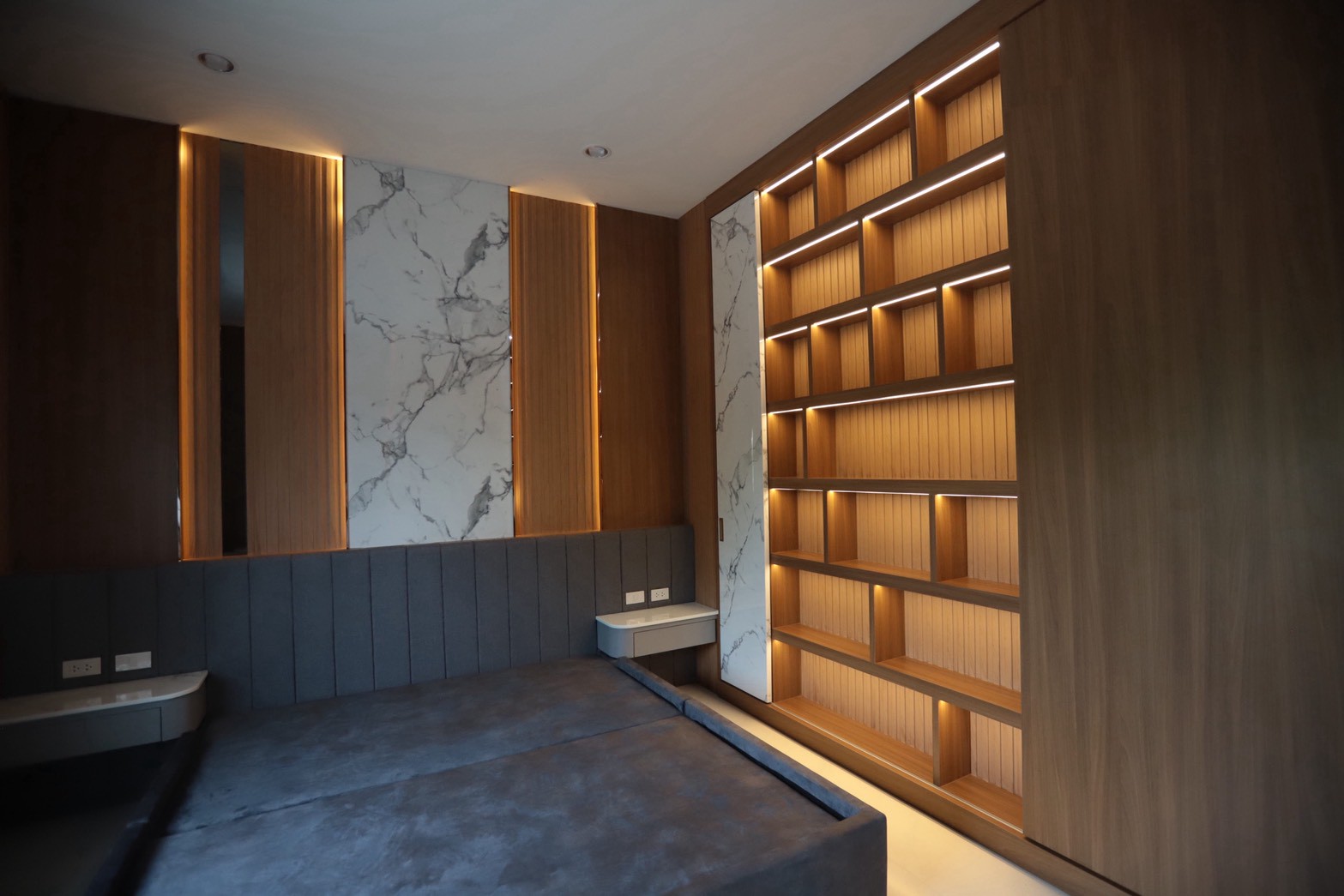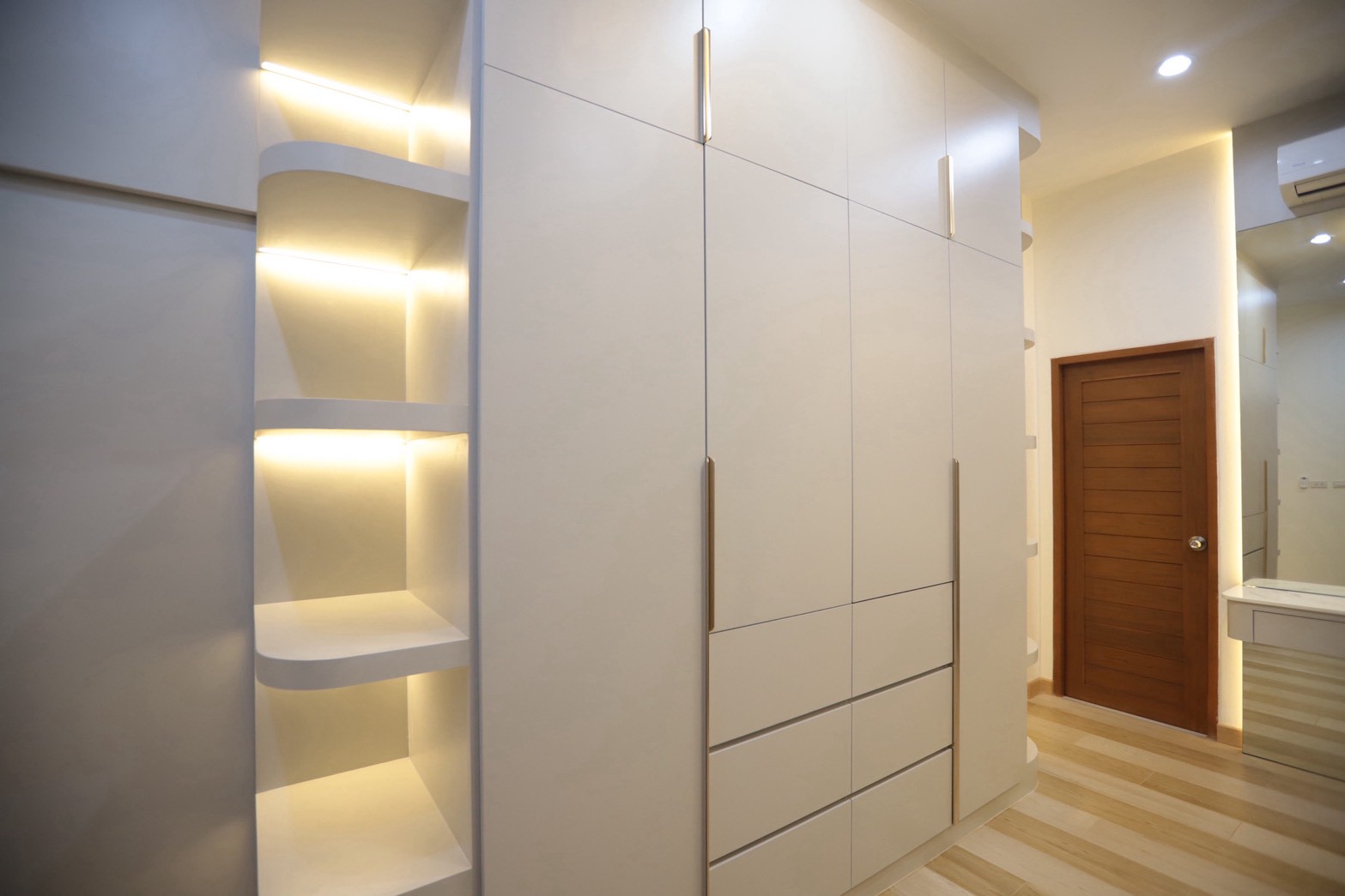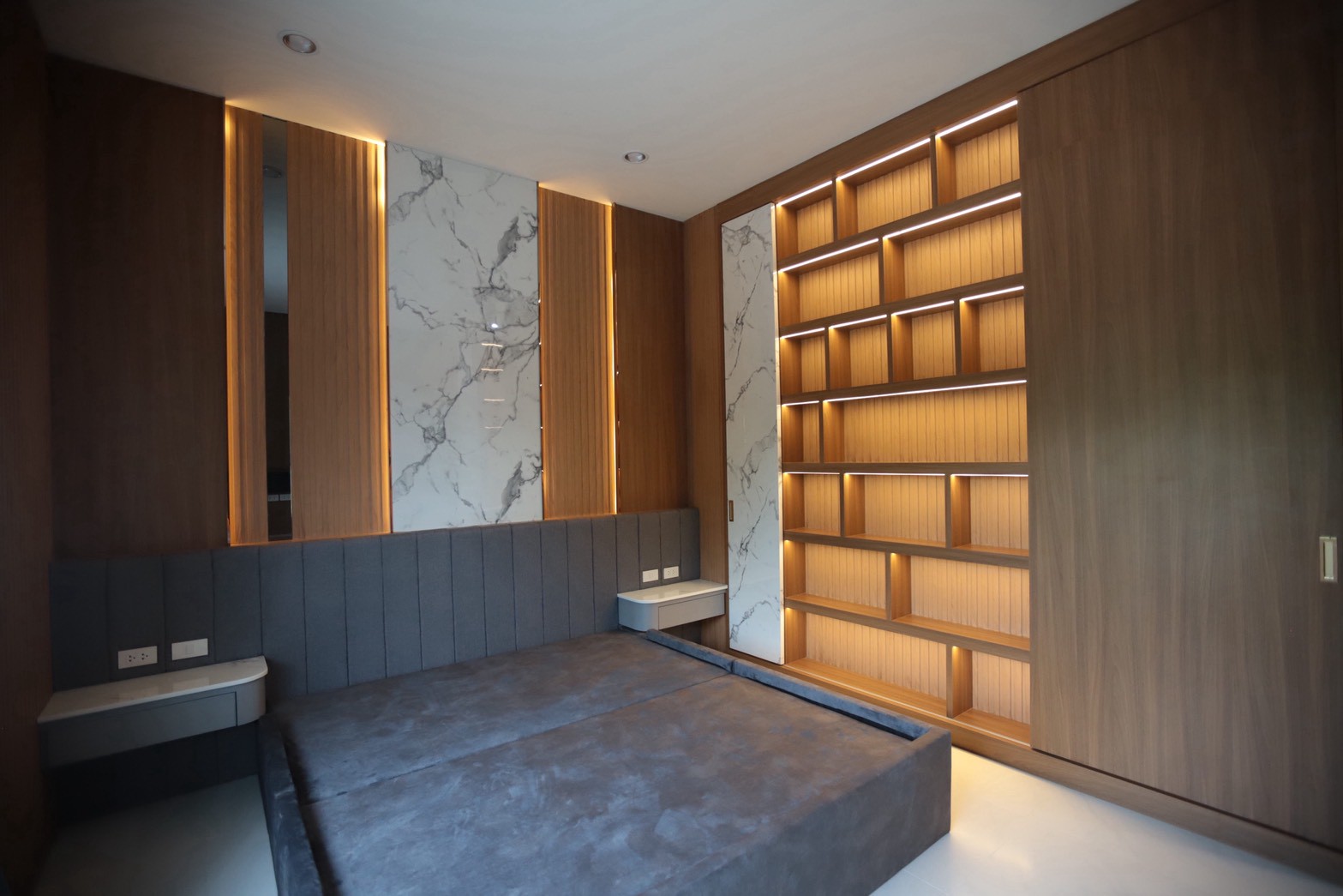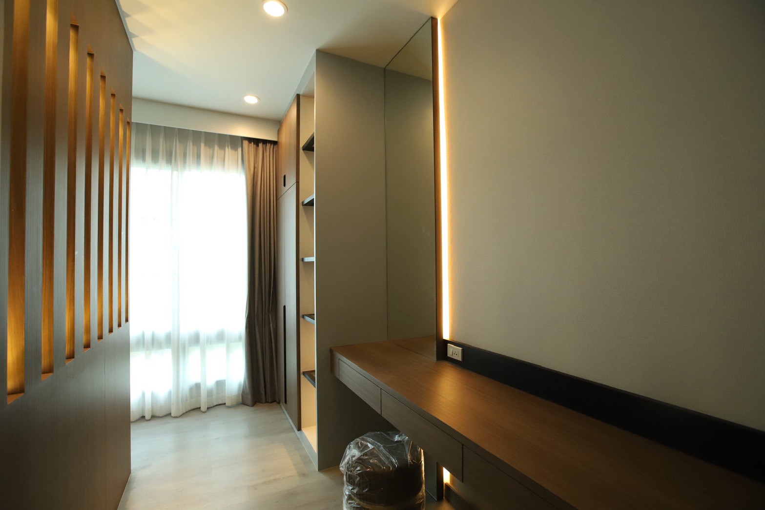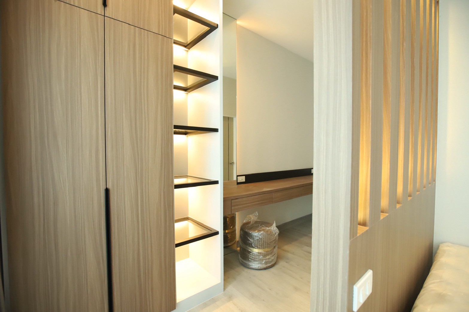 เฟอร์นิเจอร์บิวท์อินภายในบ้านเลือกใช้อุปกรณ์ระบบ Soft Close สำหรับลิ้นชักและบานพับ พร้อมติดตั้งไฟตกแต่งในตำแหน่งสำคัญเพื่อเพิ่มมิติของแสงในพื้นที่ ส่วนผ้าบุเลือกใช้วัสดุโทนสีที่สอดคล้องกับลามิเนท และเป็น ผ้าบุเกรดโรงแรม ที่มีคุณสมบัติ กันไรฝุ่นและทนการลามไฟ