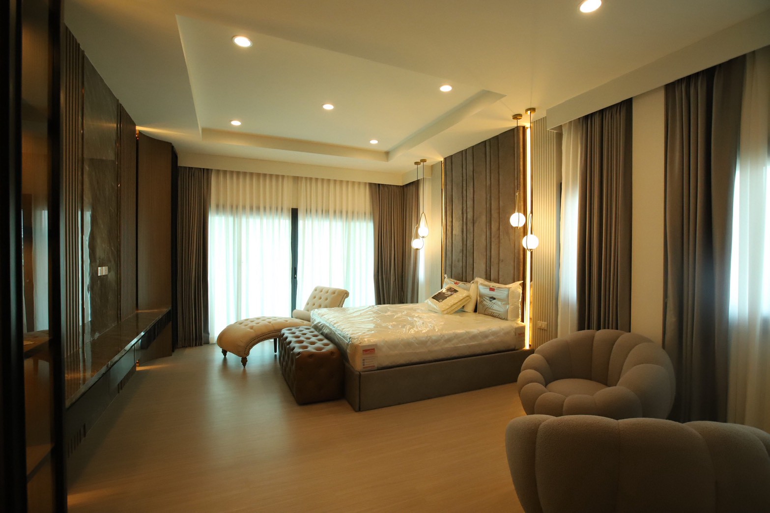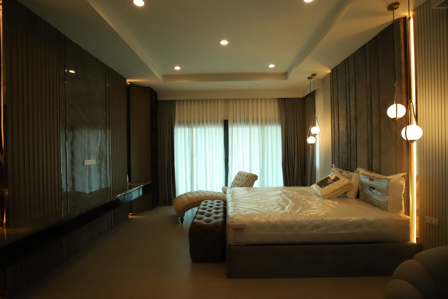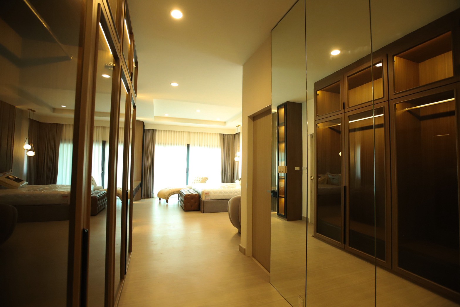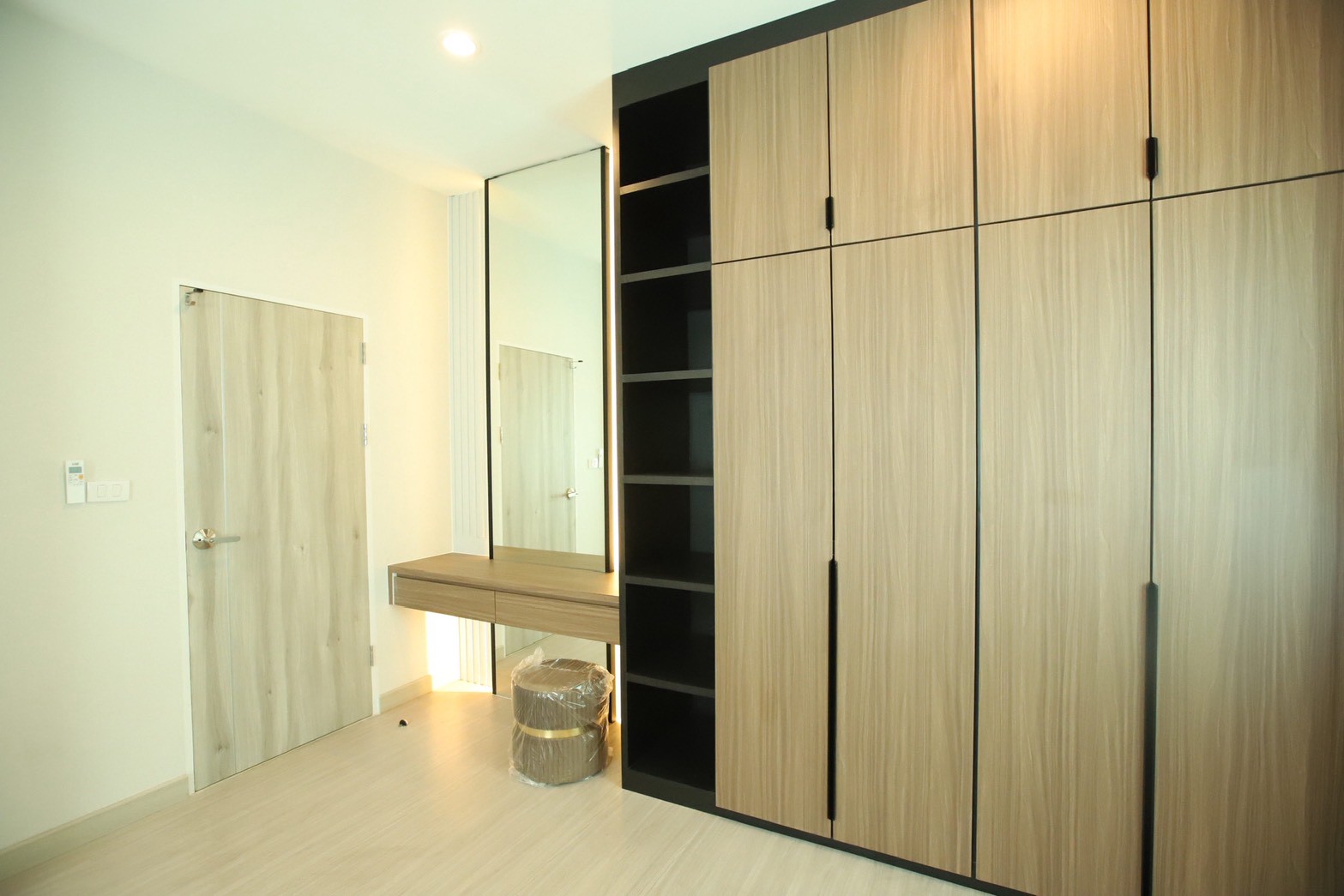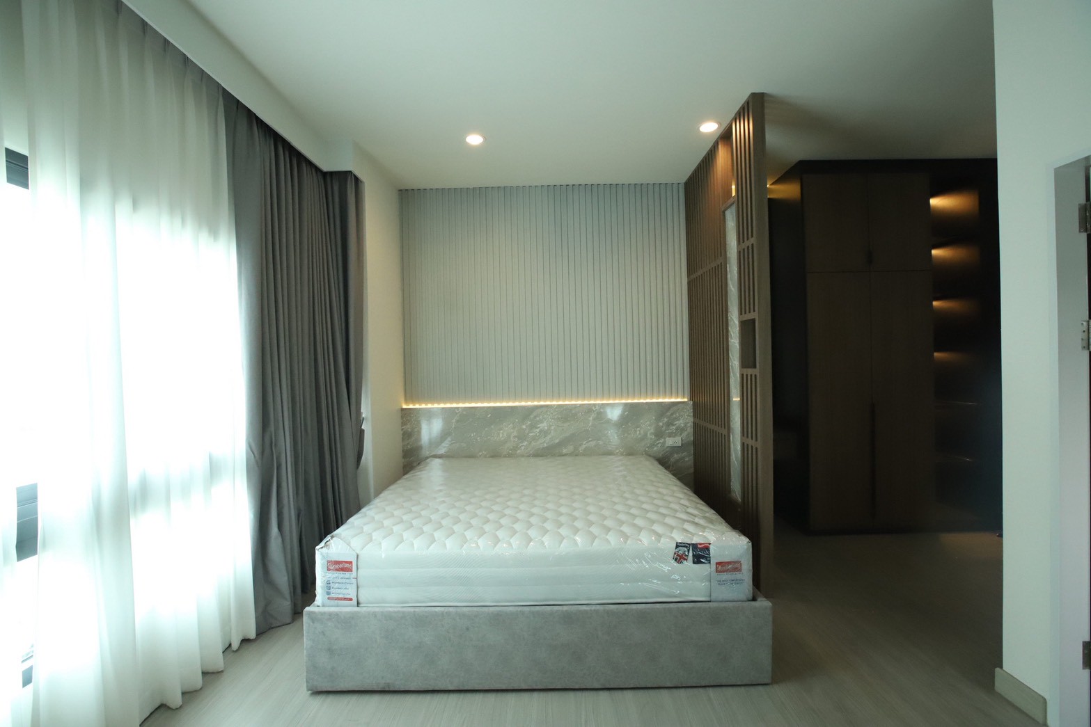 เฟอร์นิเจอร์บิวท์อินภายในบ้านเลือกใช้อุปกรณ์ระบบ Soft Close สำหรับลิ้นชักและบานพับ พร้อมติดตั้งไฟตกแต่งในตำแหน่งสำคัญเพื่อเพิ่มมิติของแสงในพื้นที่ ส่วนผ้าบุเลือกใช้วัสดุโทนสีที่สอดคล้องกับลามิเนท และเป็น ผ้าบุเกรดโรงแรม ที่มีคุณสมบัติ กันไรฝุ่นและทนการลามไฟ