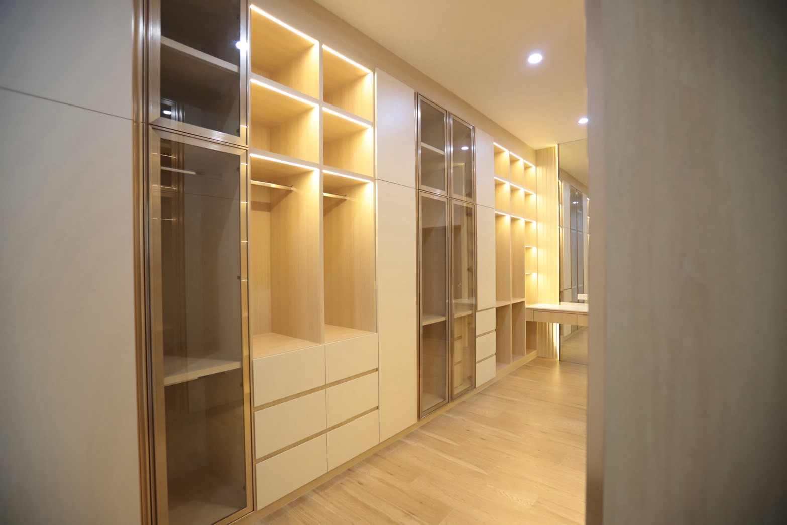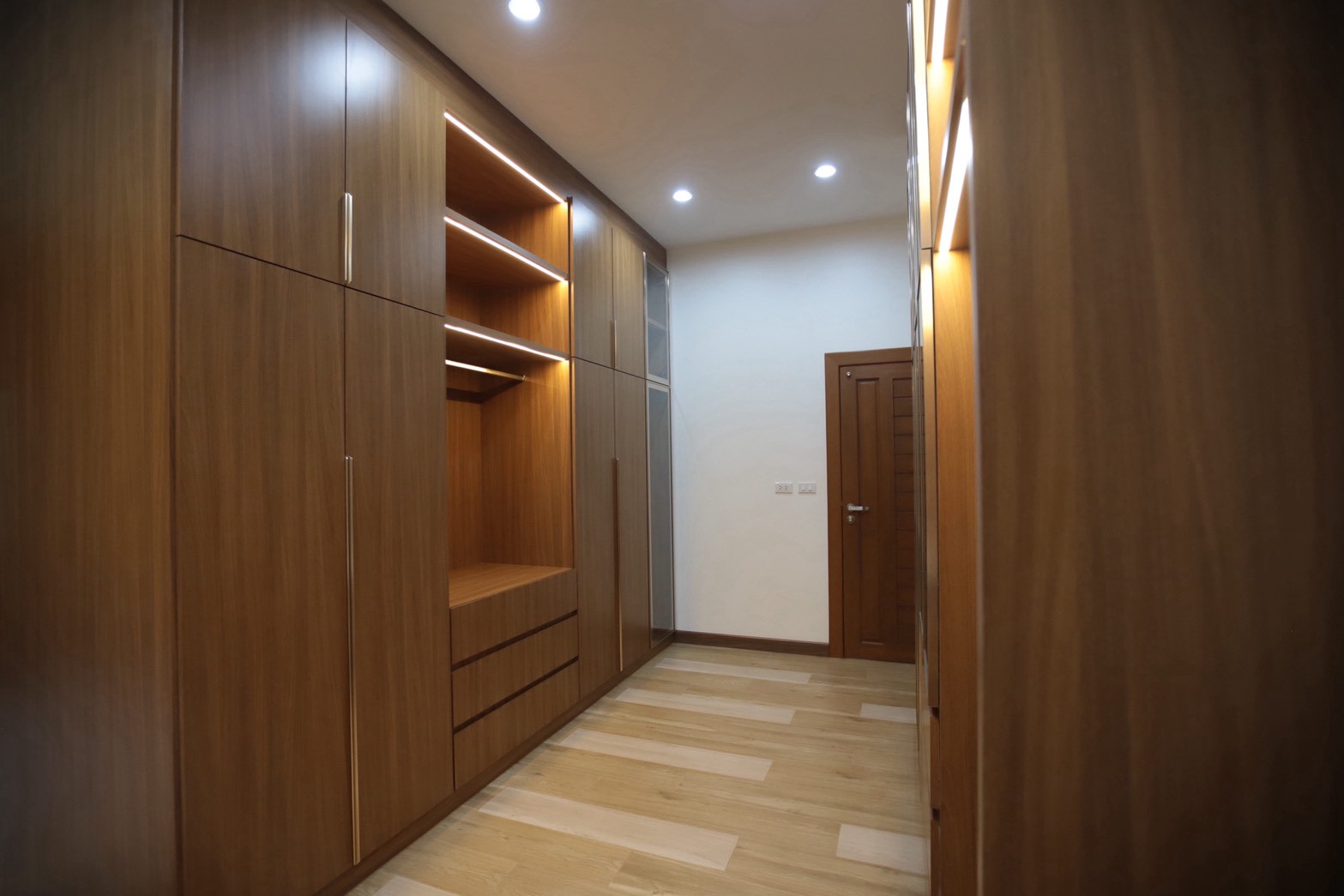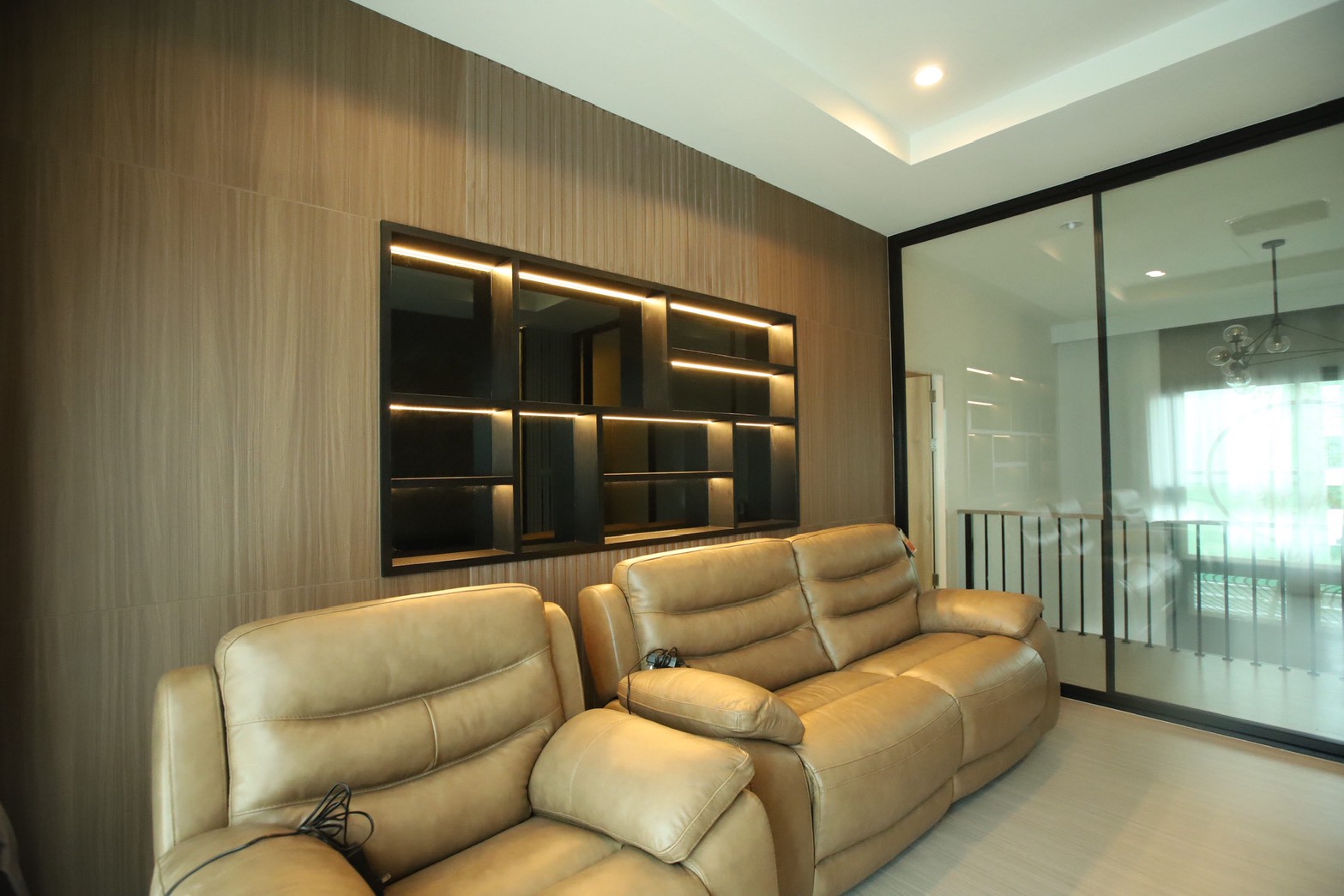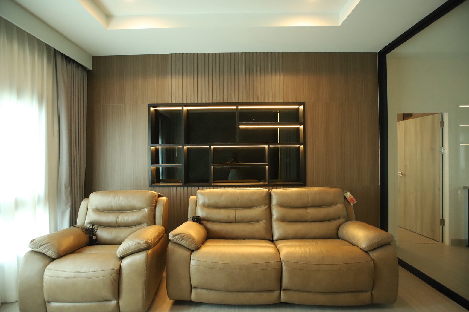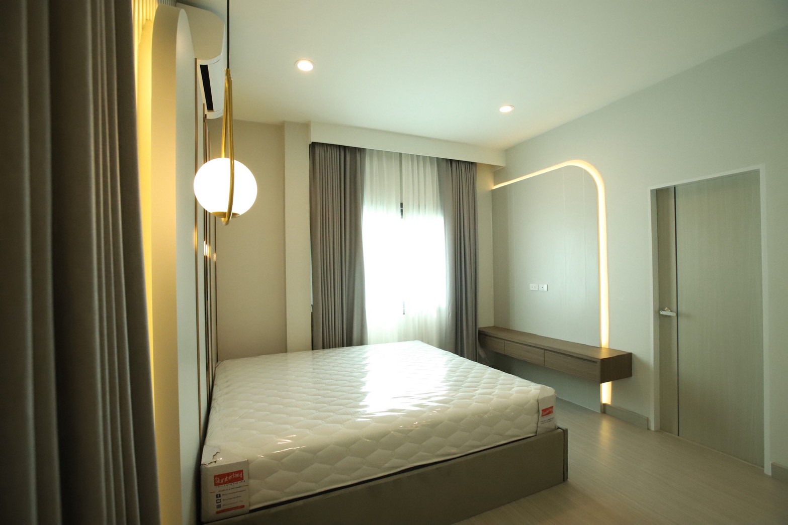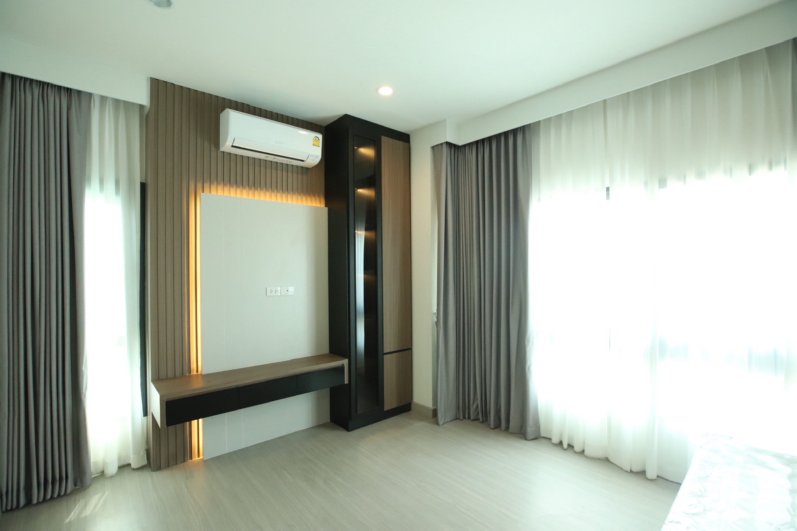 เฟอร์นิเจอร์บิวท์อินภายในบ้านเลือกใช้อุปกรณ์ระบบ Soft Close สำหรับลิ้นชักและบานพับ พร้อมติดตั้งไฟตกแต่งในตำแหน่งสำคัญเพื่อเพิ่มมิติของแสงในพื้นที่ ส่วนผ้าบุเลือกใช้วัสดุโทนสีที่สอดคล้องกับลามิเนท และเป็น ผ้าบุเกรดโรงแรม ที่มีคุณสมบัติ กันไรฝุ่นและทนการลามไฟ