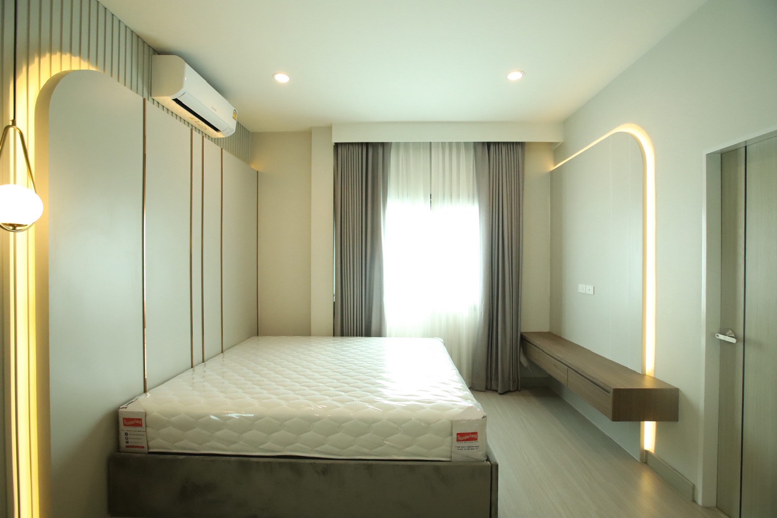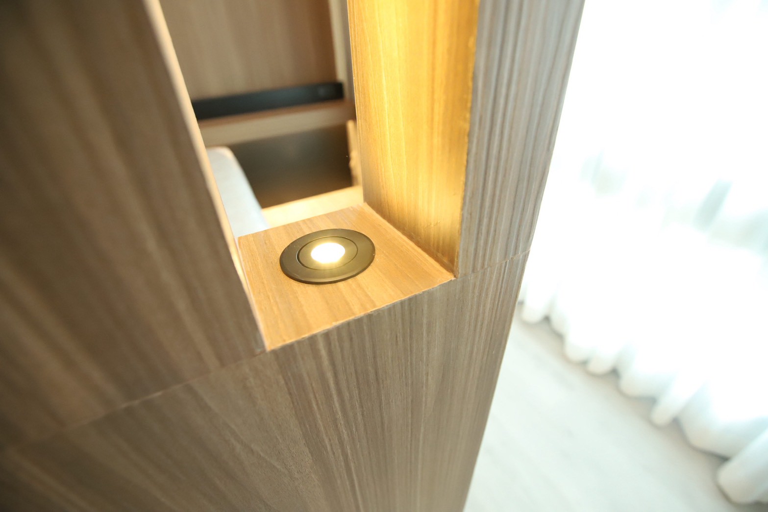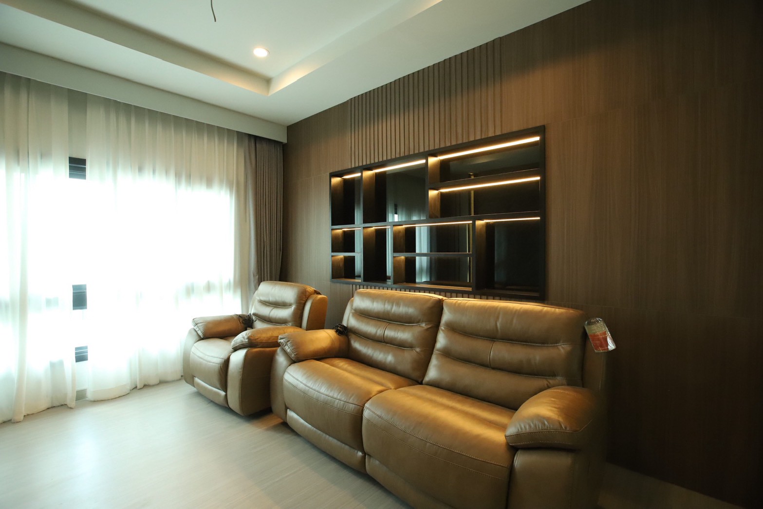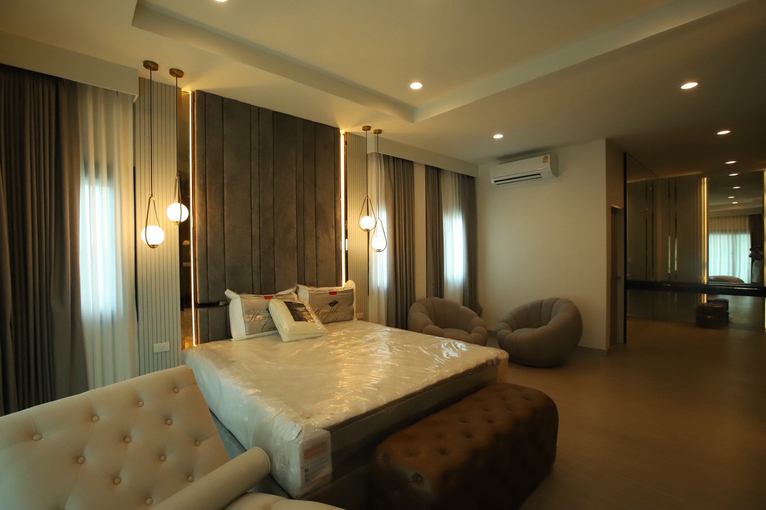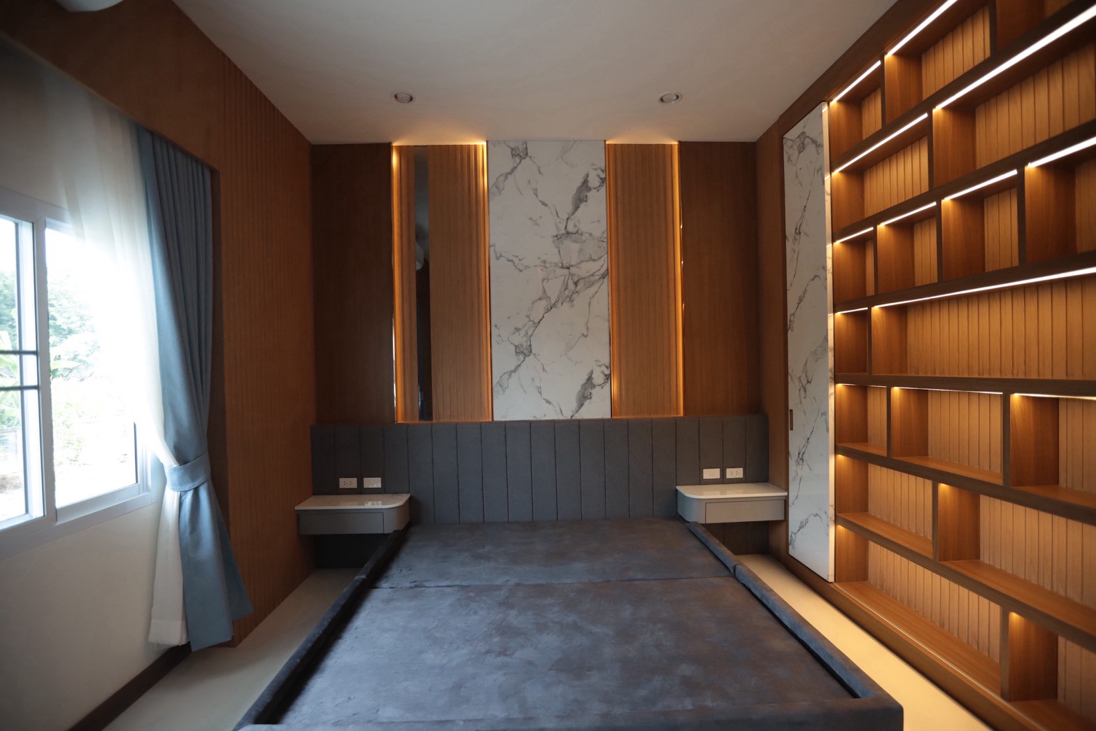 เฟอร์นิเจอร์บิวท์อินภายในบ้านเลือกใช้อุปกรณ์ระบบ Soft Close สำหรับลิ้นชักและบานพับ พร้อมติดตั้งไฟตกแต่งในตำแหน่งสำคัญเพื่อเพิ่มมิติของแสงในพื้นที่ ส่วนผ้าบุเลือกใช้วัสดุโทนสีที่สอดคล้องกับลามิเนท และเป็น ผ้าบุเกรดโรงแรม ที่มีคุณสมบัติ กันไรฝุ่นและทนการลามไฟ