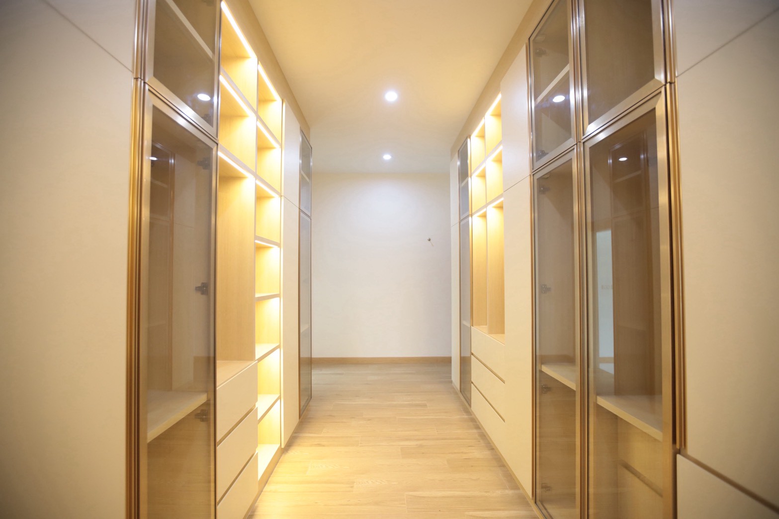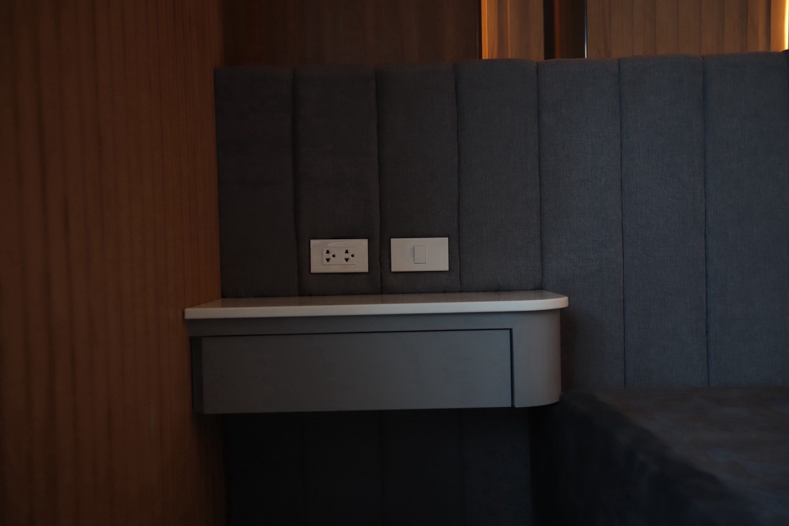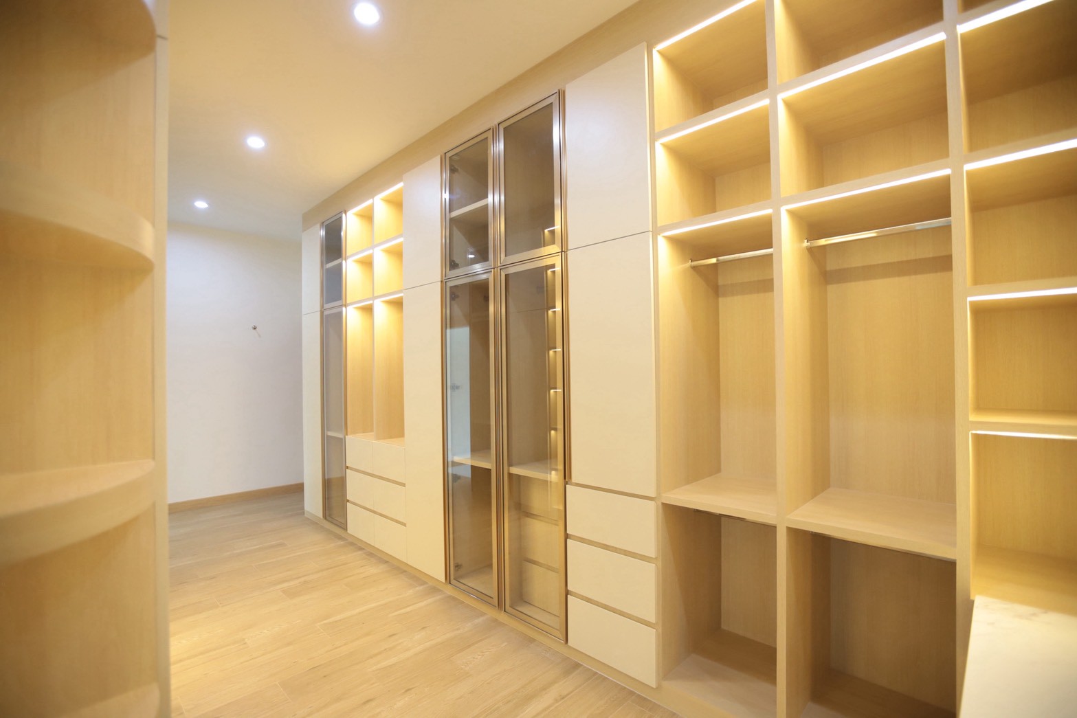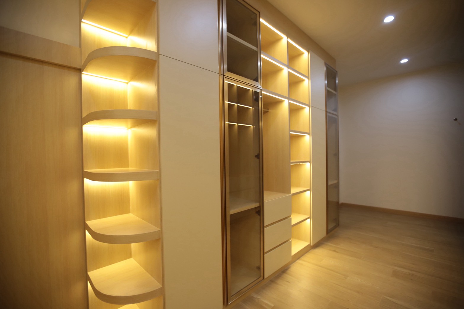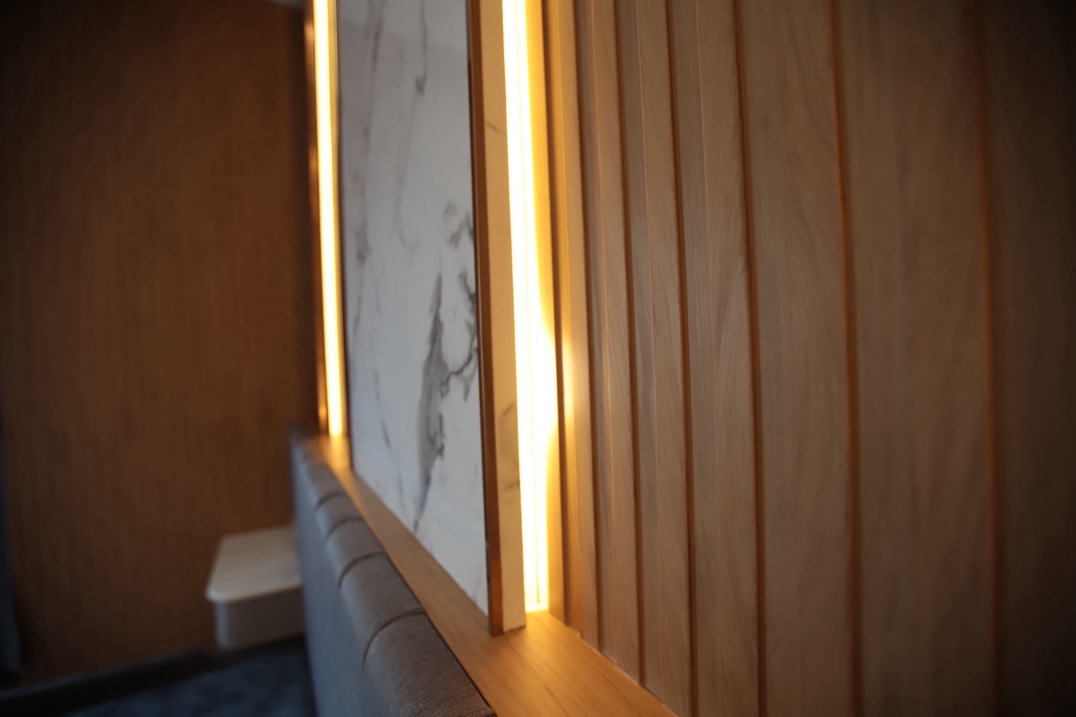 เฟอร์นิเจอร์บิวท์อินภายในบ้านเลือกใช้อุปกรณ์ระบบ Soft Close สำหรับลิ้นชักและบานพับ พร้อมติดตั้งไฟตกแต่งในตำแหน่งสำคัญเพื่อเพิ่มมิติของแสงในพื้นที่ ส่วนผ้าบุเลือกใช้วัสดุโทนสีที่สอดคล้องกับลามิเนท และเป็น ผ้าบุเกรดโรงแรม ที่มีคุณสมบัติ กันไรฝุ่นและทนการลามไฟ