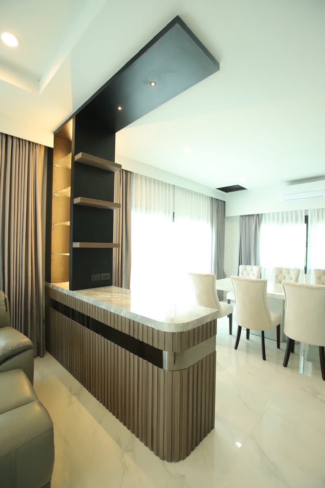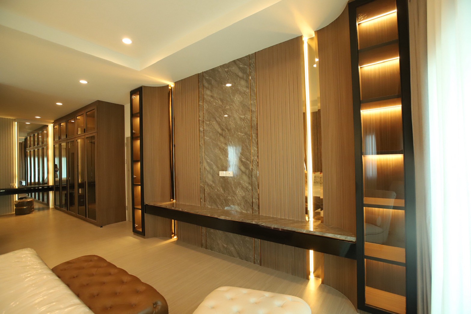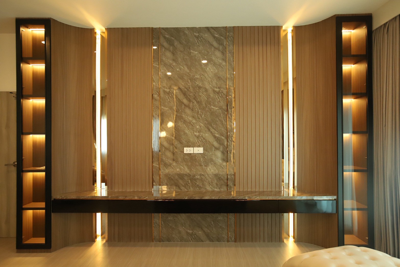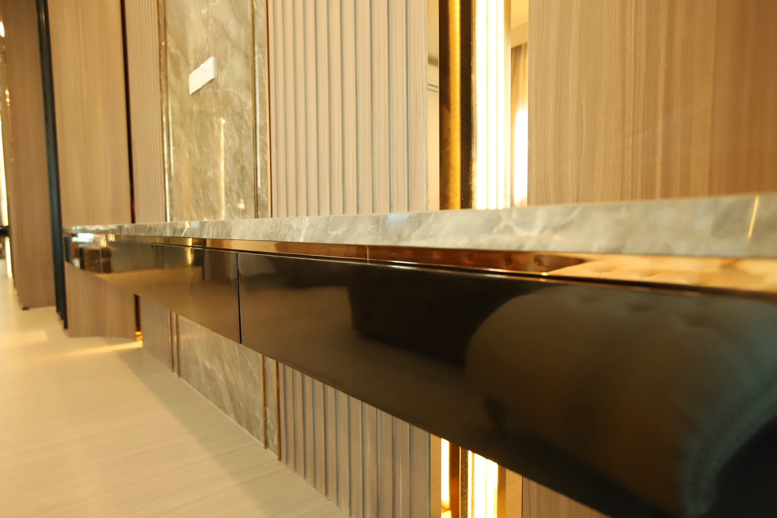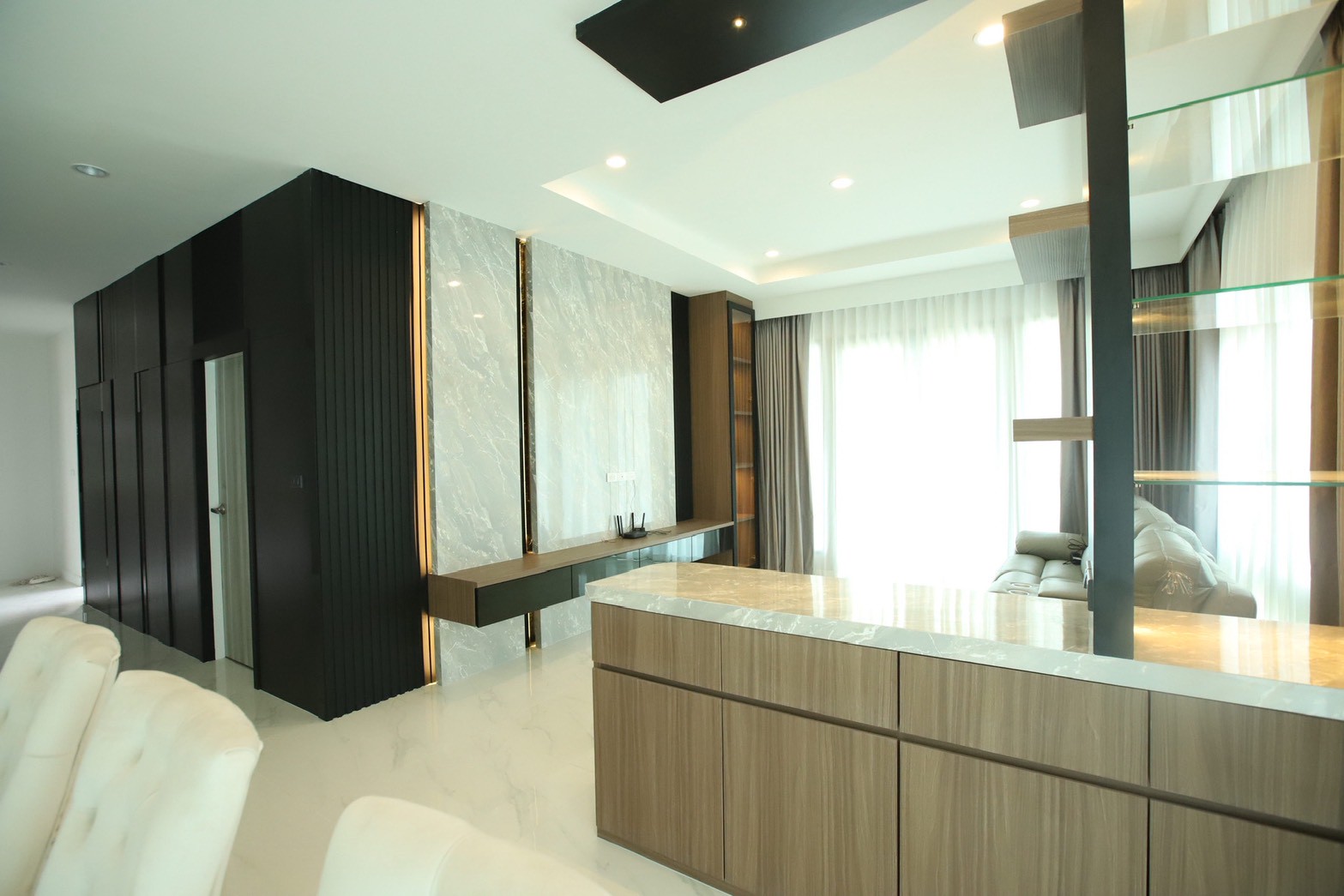 ในรายละเอียดของงานตกแต่ง หน้าบานลิ้นชัก ถูกออกแบบด้วย กระจกเงาสีดำ เพื่อเพิ่มมิติและความหรูหราให้กับเฟอร์นิเจอร์ ขณะที่พื้นผิวบางส่วนเลือกใช้ หินอ่อนสีเทาลาย Emperador Gray ซึ่งช่วยเสริมภาพลักษณ์ที่เรียบหรู และยังสอดคล้องกับแนวคิดด้าน ฮวงจุ้ย ที่เจ้าของบ้านให้ความสำคัญ