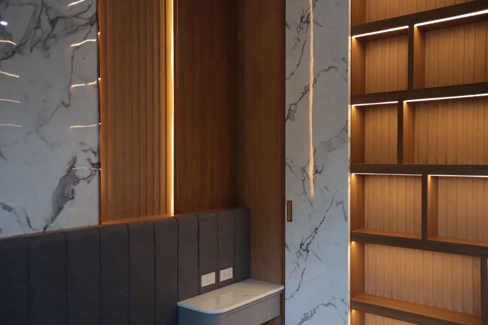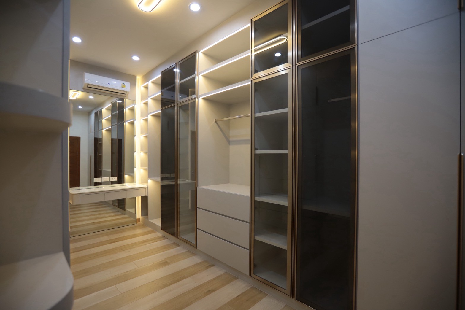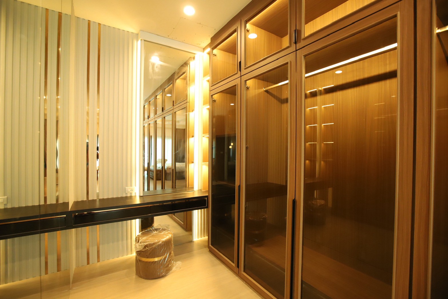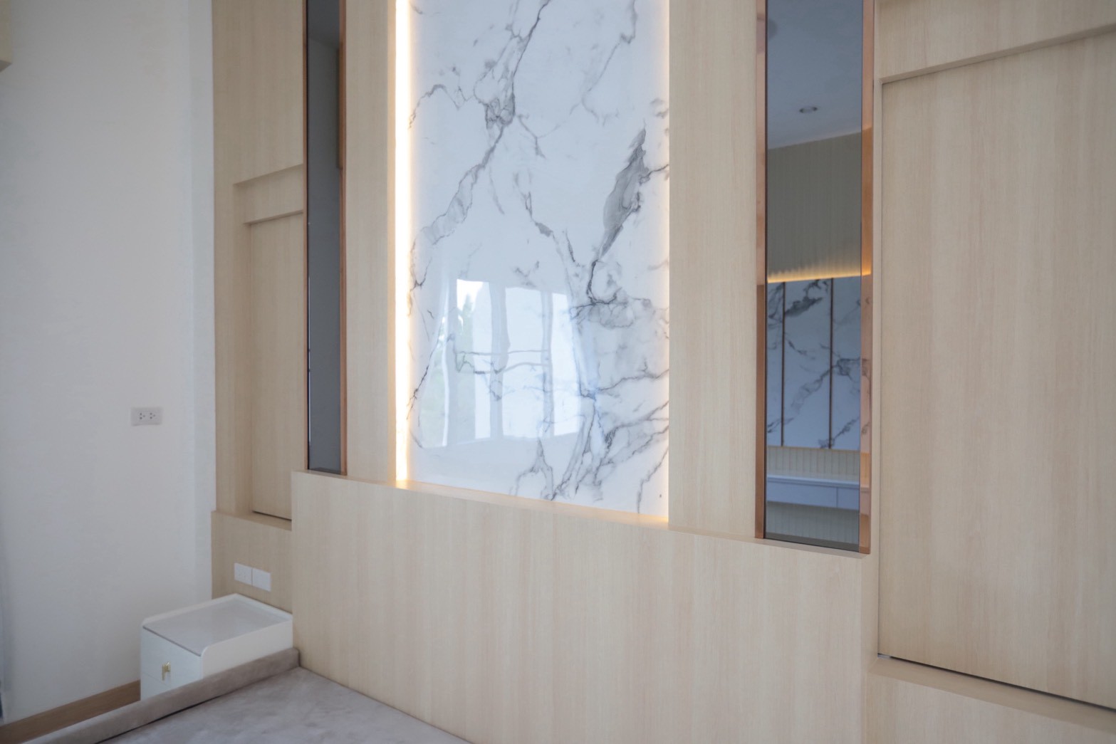 ในรายละเอียดของงานตกแต่ง หน้าบานลิ้นชัก ถูกออกแบบด้วย กระจกเงาสีดำ เพื่อเพิ่มมิติและความหรูหราให้กับเฟอร์นิเจอร์ ขณะที่พื้นผิวบางส่วนเลือกใช้ หินอ่อนสีเทาลาย Emperador Gray ซึ่งช่วยเสริมภาพลักษณ์ที่เรียบหรู และยังสอดคล้องกับแนวคิดด้าน ฮวงจุ้ย ที่เจ้าของบ้านให้ความสำคัญ
