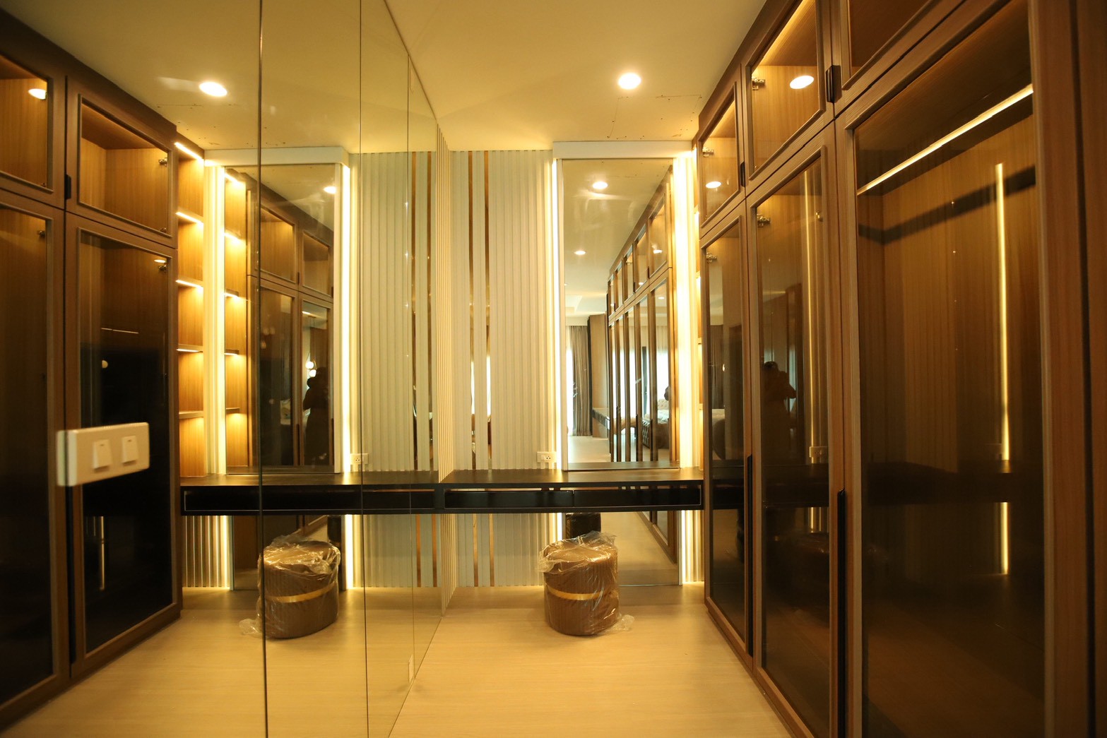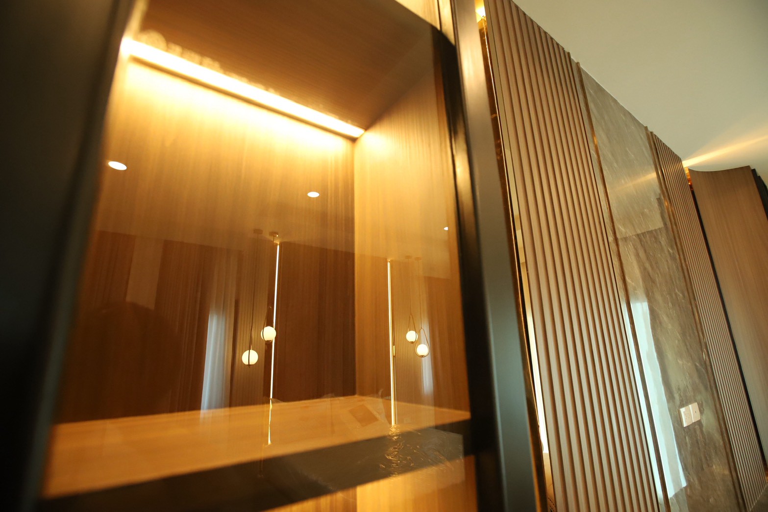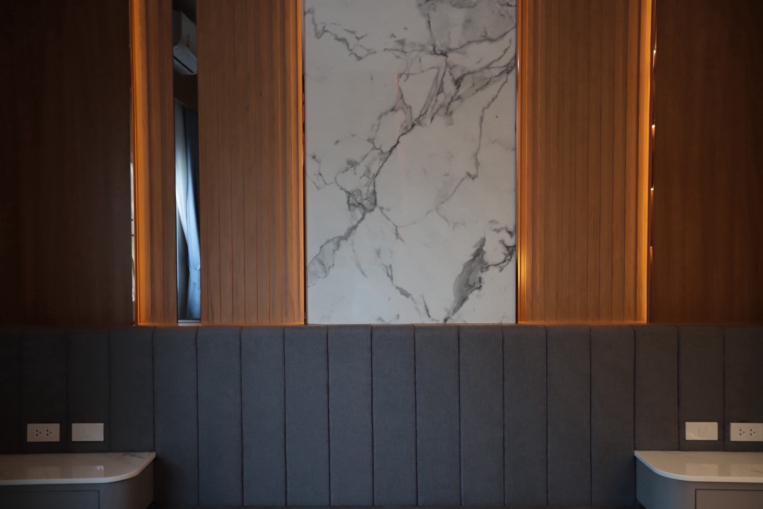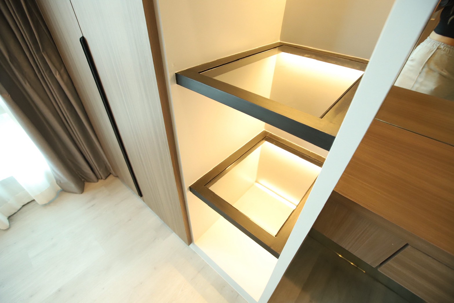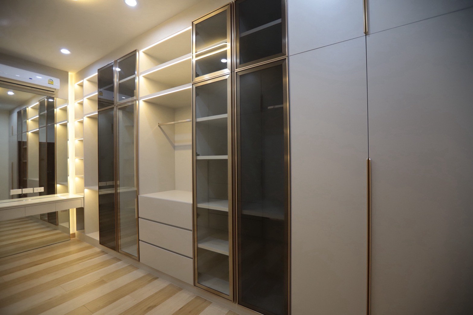 ในรายละเอียดของงานตกแต่ง หน้าบานลิ้นชัก ถูกออกแบบด้วย กระจกเงาสีดำ เพื่อเพิ่มมิติและความหรูหราให้กับเฟอร์นิเจอร์ ขณะที่พื้นผิวบางส่วนเลือกใช้ หินอ่อนสีเทาลาย Emperador Gray ซึ่งช่วยเสริมภาพลักษณ์ที่เรียบหรู และยังสอดคล้องกับแนวคิดด้าน ฮวงจุ้ย ที่เจ้าของบ้านให้ความสำคัญ