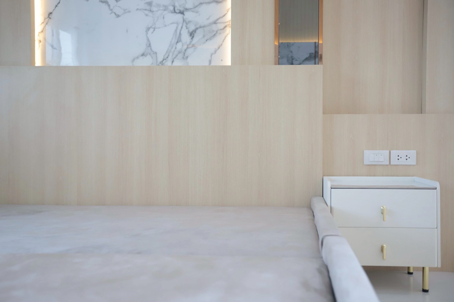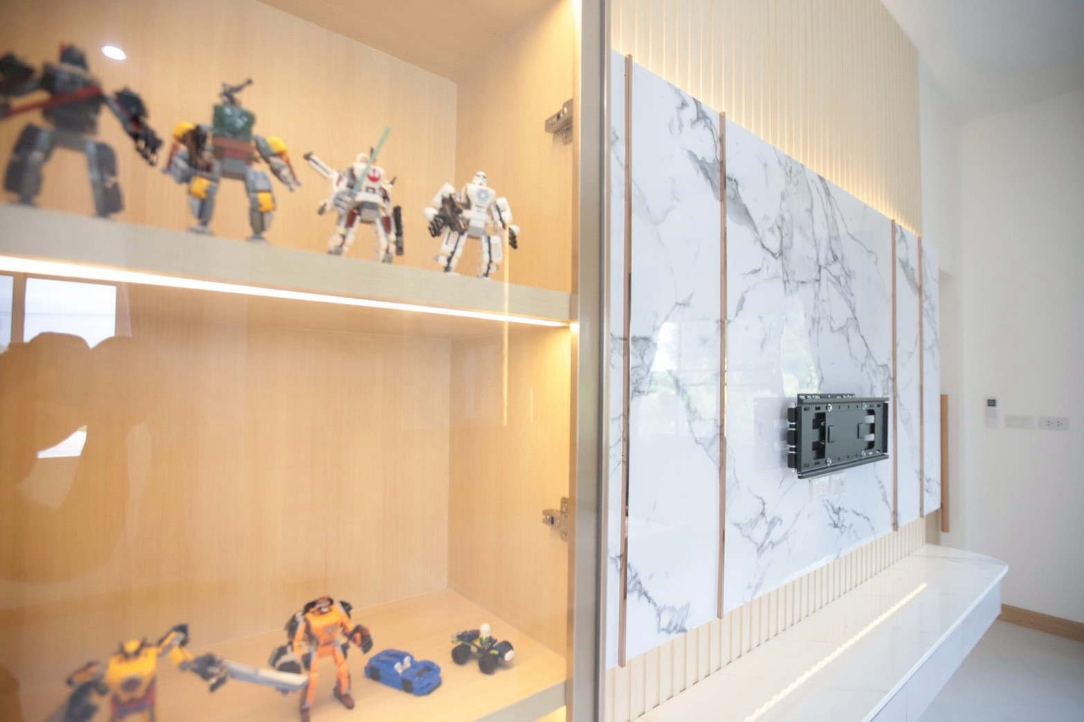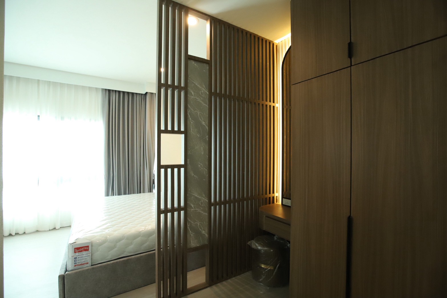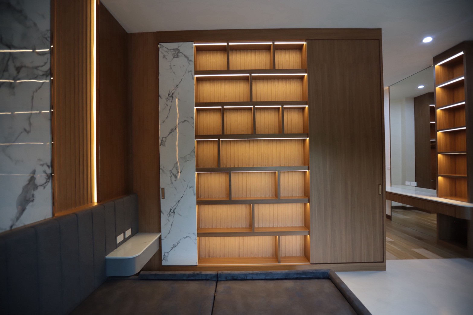 ในรายละเอียดของงานตกแต่ง หน้าบานลิ้นชัก ถูกออกแบบด้วย กระจกเงาสีดำ เพื่อเพิ่มมิติและความหรูหราให้กับเฟอร์นิเจอร์ ขณะที่พื้นผิวบางส่วนเลือกใช้ หินอ่อนสีเทาลาย Emperador Gray ซึ่งช่วยเสริมภาพลักษณ์ที่เรียบหรู และยังสอดคล้องกับแนวคิดด้าน ฮวงจุ้ย ที่เจ้าของบ้านให้ความสำคัญ