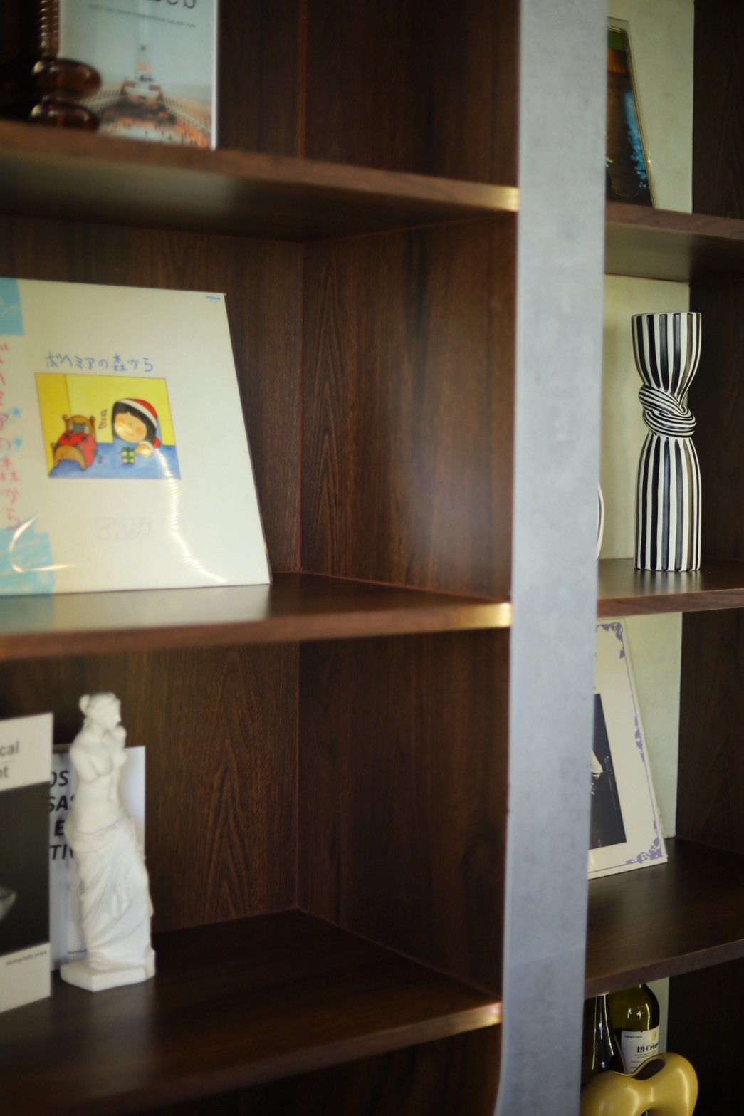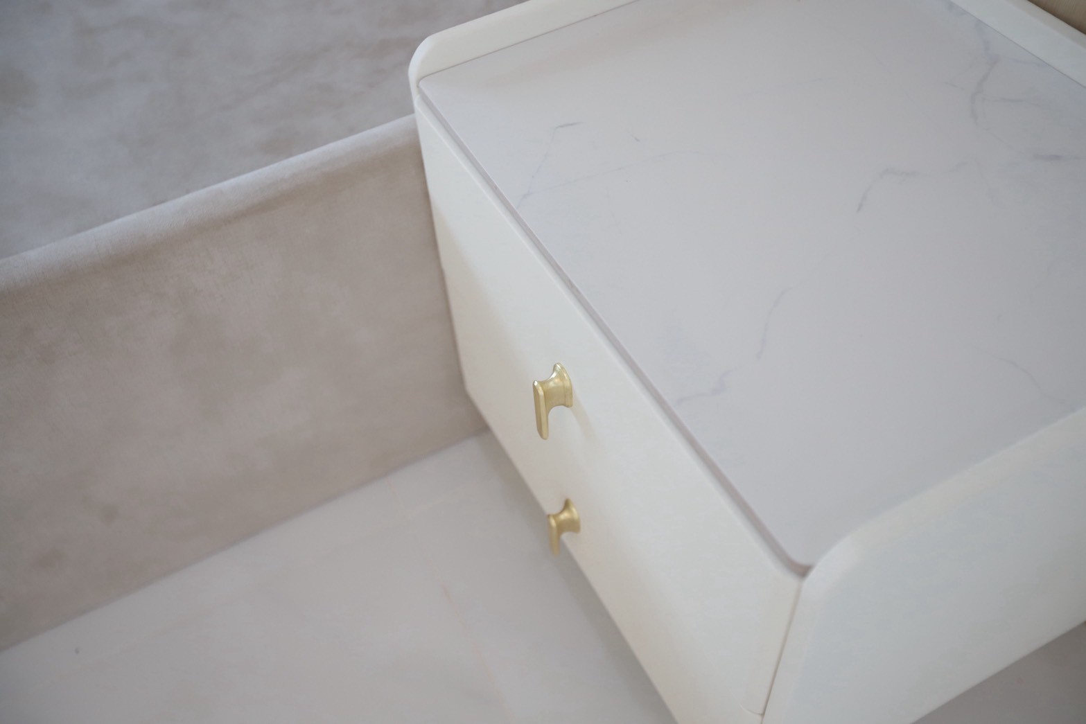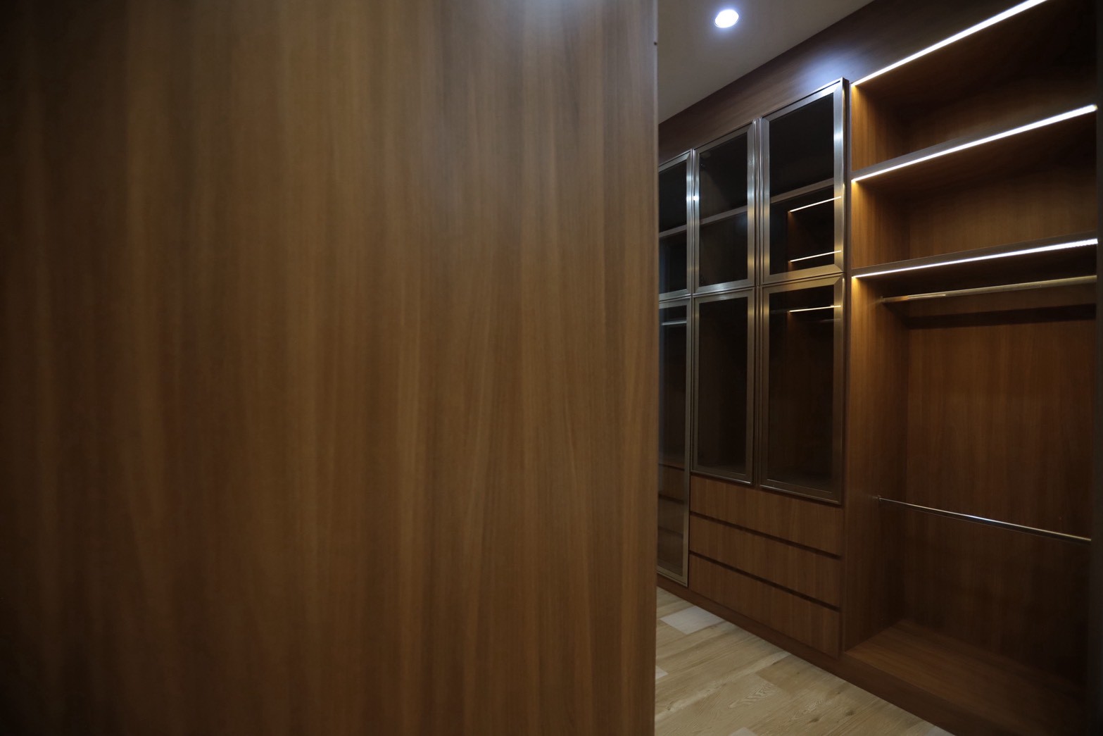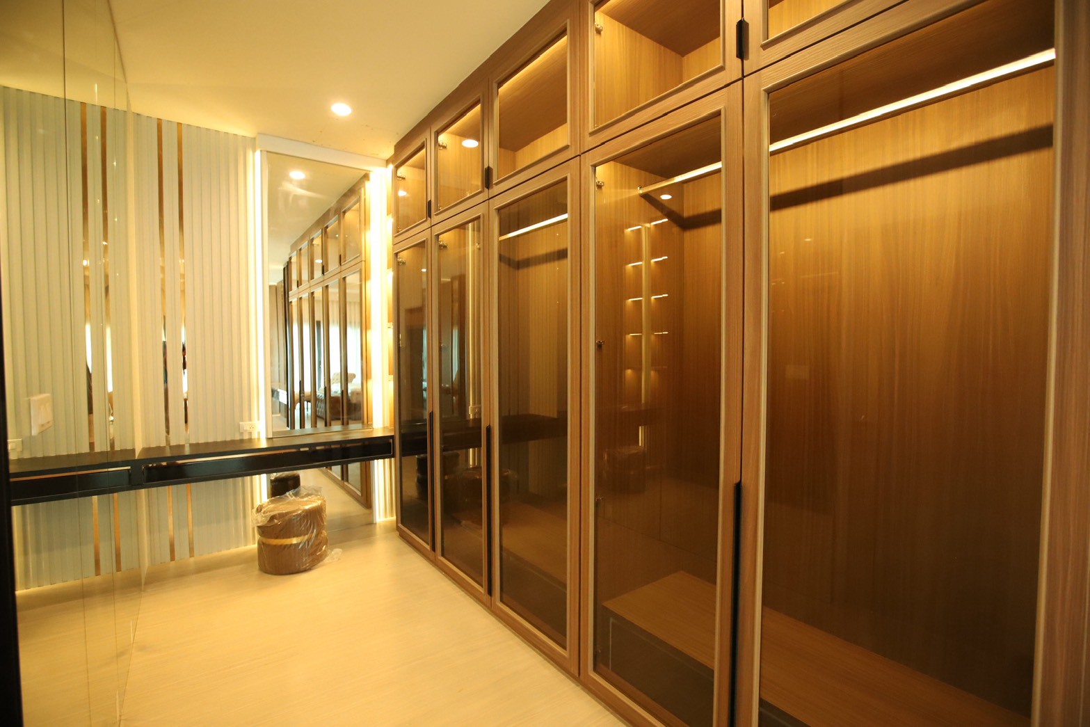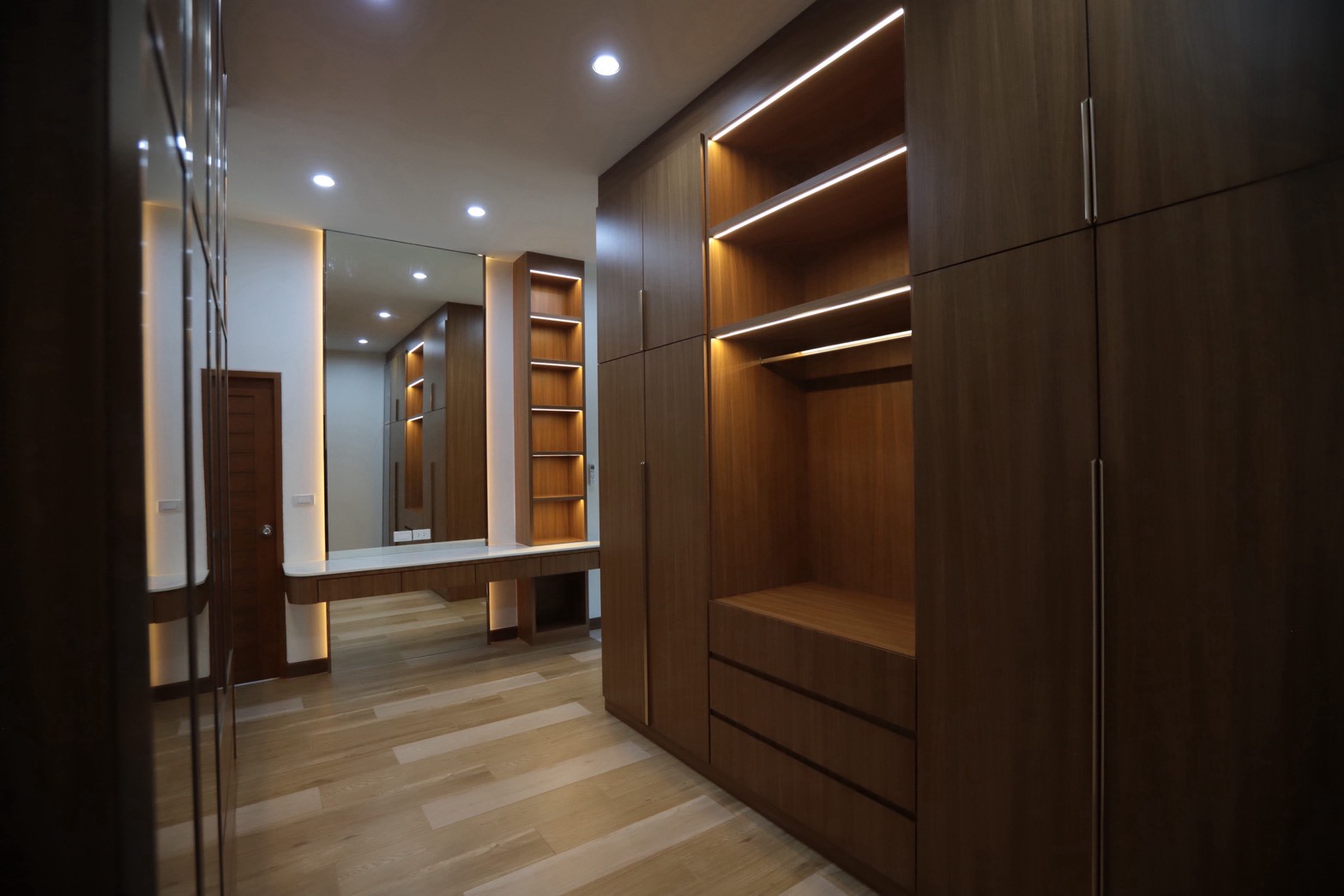 ในรายละเอียดของงานตกแต่ง หน้าบานลิ้นชัก ถูกออกแบบด้วย กระจกเงาสีดำ เพื่อเพิ่มมิติและความหรูหราให้กับเฟอร์นิเจอร์ ขณะที่พื้นผิวบางส่วนเลือกใช้ หินอ่อนสีเทาลาย Emperador Gray ซึ่งช่วยเสริมภาพลักษณ์ที่เรียบหรู และยังสอดคล้องกับแนวคิดด้าน ฮวงจุ้ย ที่เจ้าของบ้านให้ความสำคัญ