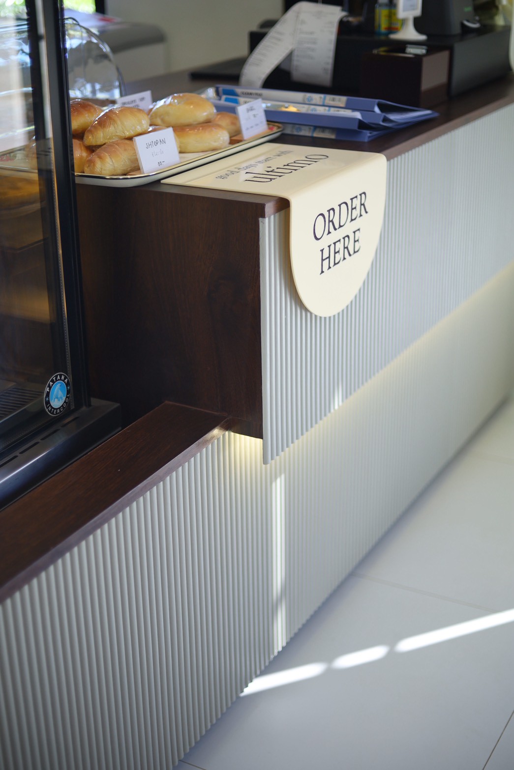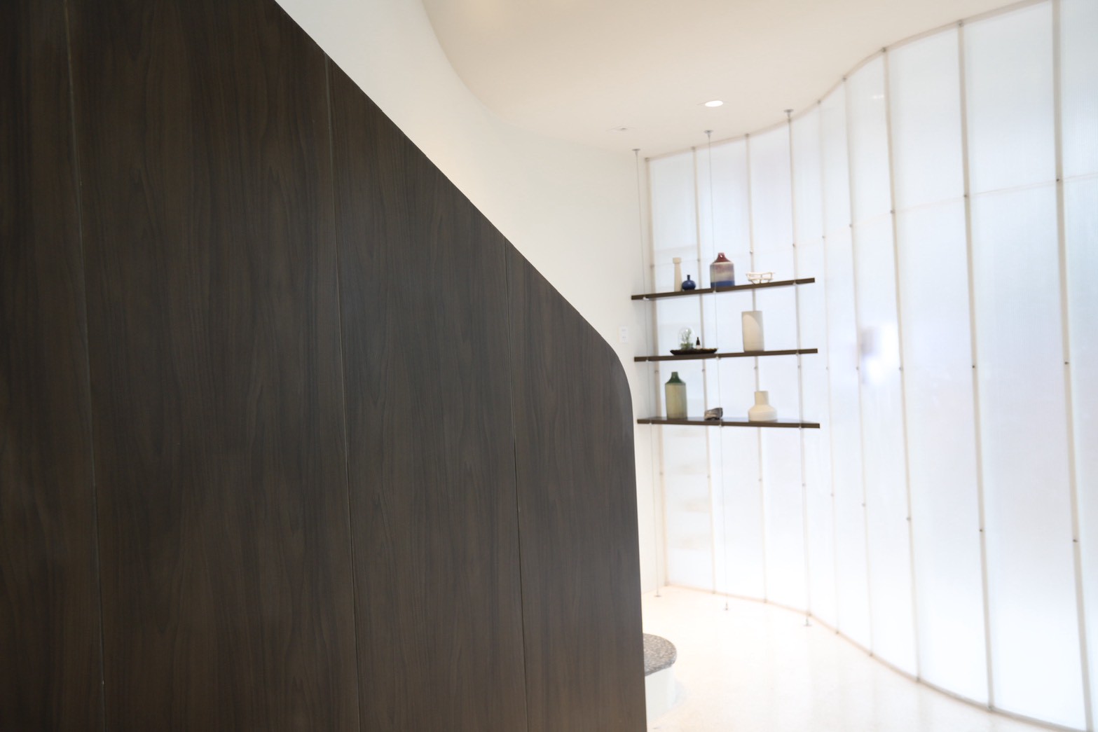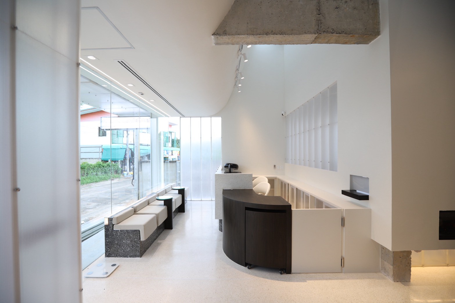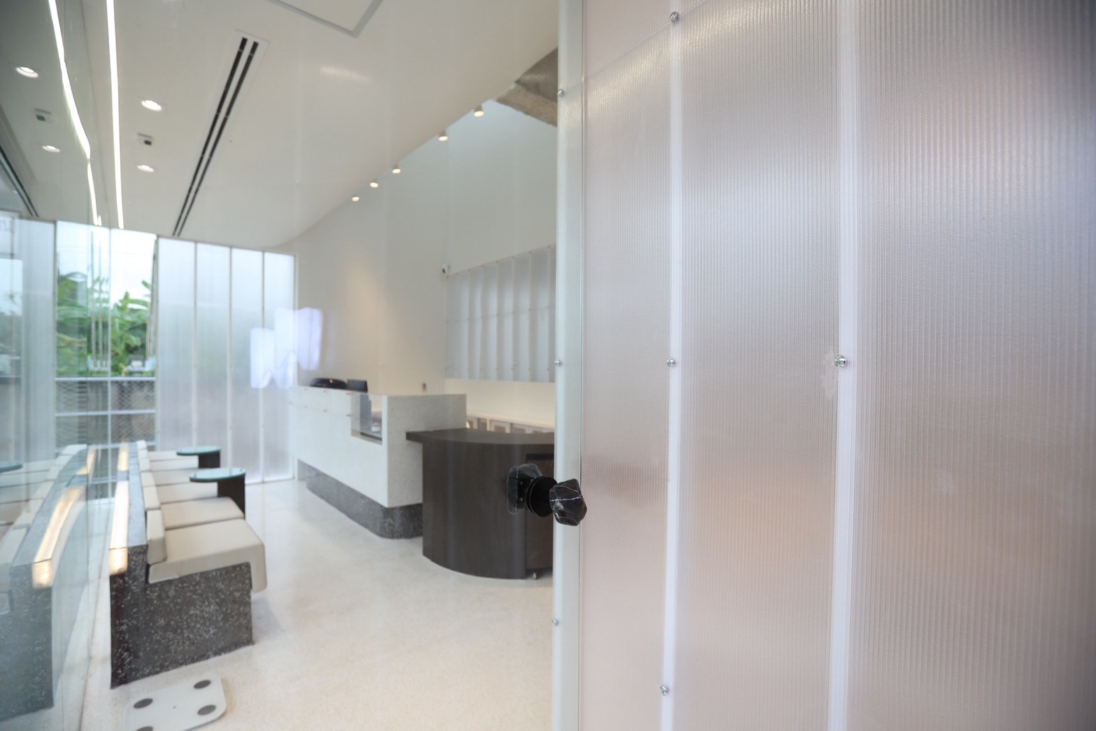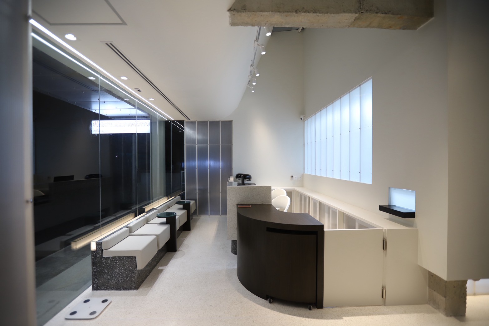 อีกองค์ประกอบเด่นคือผนังที่ใช้ แผ่น Polycarbonate โปร่งแสง ซึ่งถูกออกแบบให้ดัดโค้งเพื่อสร้างเส้นสายที่นุ่มนวลให้กับพื้นที่ ความท้าทายของงานนี้อยู่ที่การทำให้วัสดุสามารถขึ้นรูปโค้งได้อย่างเรียบร้อย แข็งแรง และสอดคล้องกับดีไซน์โดยรวม ทีมงานจึงต้องพัฒนาวิธีการติดตั้งและโครงสร้างรองรับอย่างพิถีพิถัน เพื่อให้ได้ผลลัพธ์ที่ทั้งสวยงามและใช้งานได้จริง