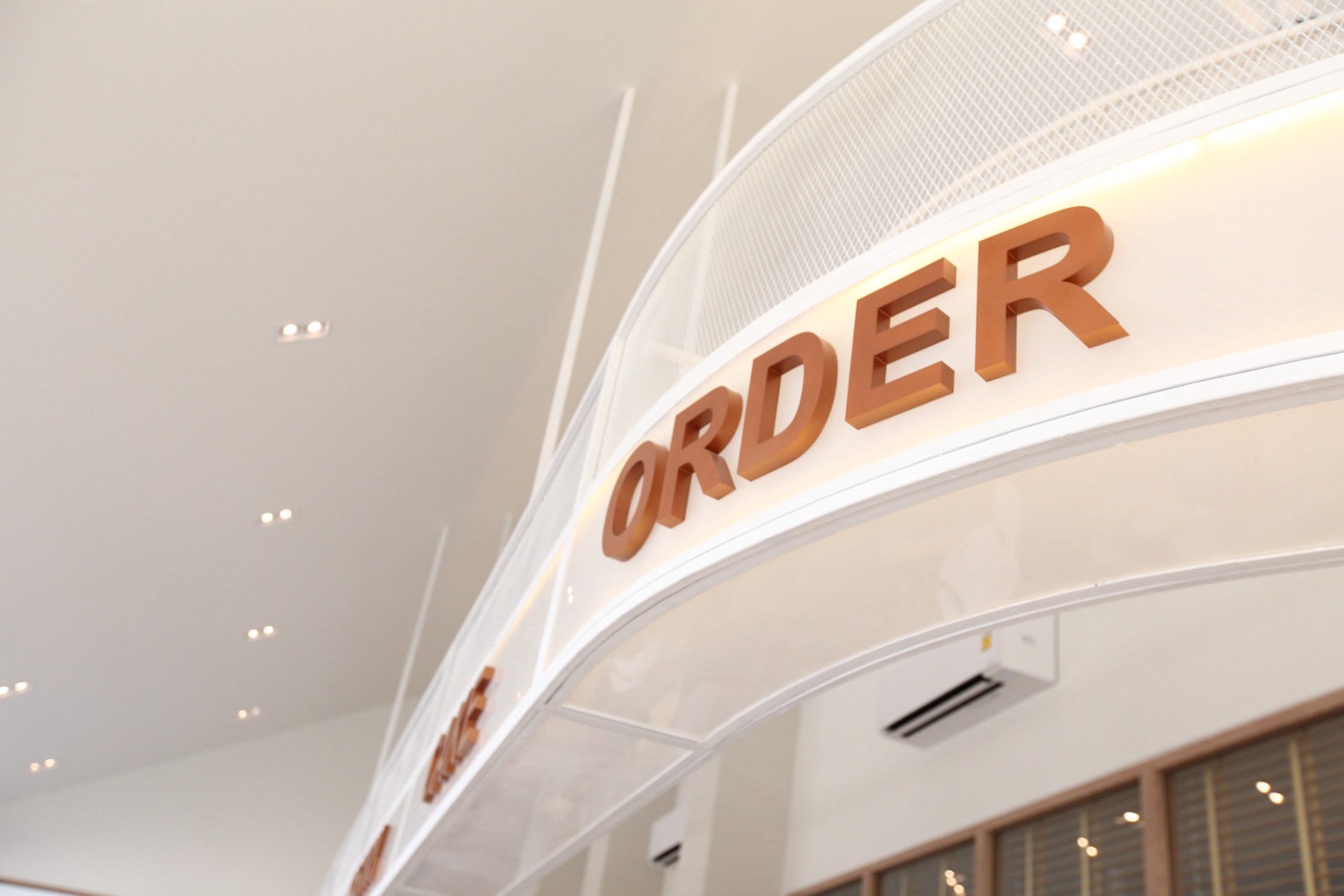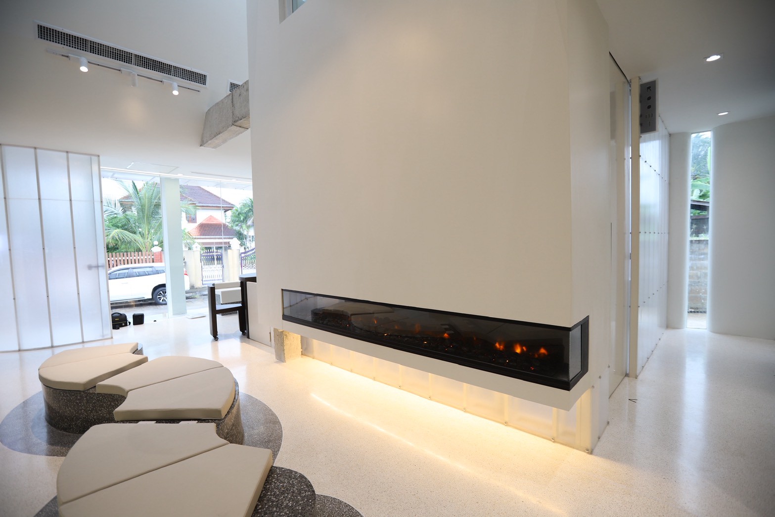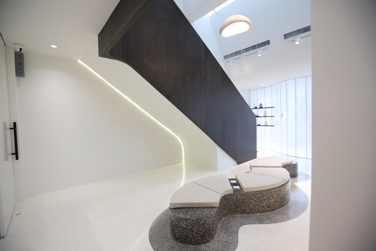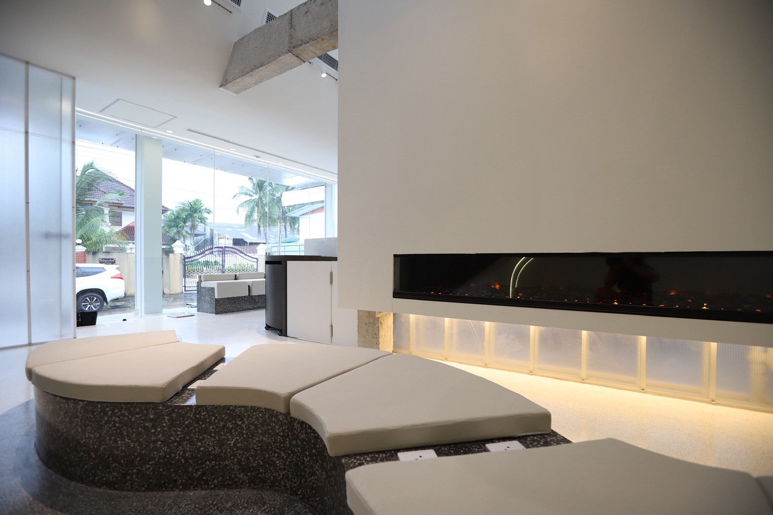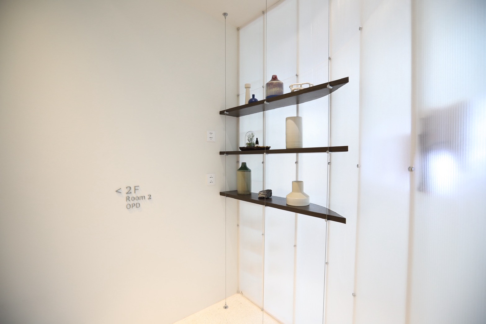 อีกองค์ประกอบเด่นคือผนังที่ใช้ แผ่น Polycarbonate โปร่งแสง ซึ่งถูกออกแบบให้ดัดโค้งเพื่อสร้างเส้นสายที่นุ่มนวลให้กับพื้นที่ ความท้าทายของงานนี้อยู่ที่การทำให้วัสดุสามารถขึ้นรูปโค้งได้อย่างเรียบร้อย แข็งแรง และสอดคล้องกับดีไซน์โดยรวม ทีมงานจึงต้องพัฒนาวิธีการติดตั้งและโครงสร้างรองรับอย่างพิถีพิถัน เพื่อให้ได้ผลลัพธ์ที่ทั้งสวยงามและใช้งานได้จริง