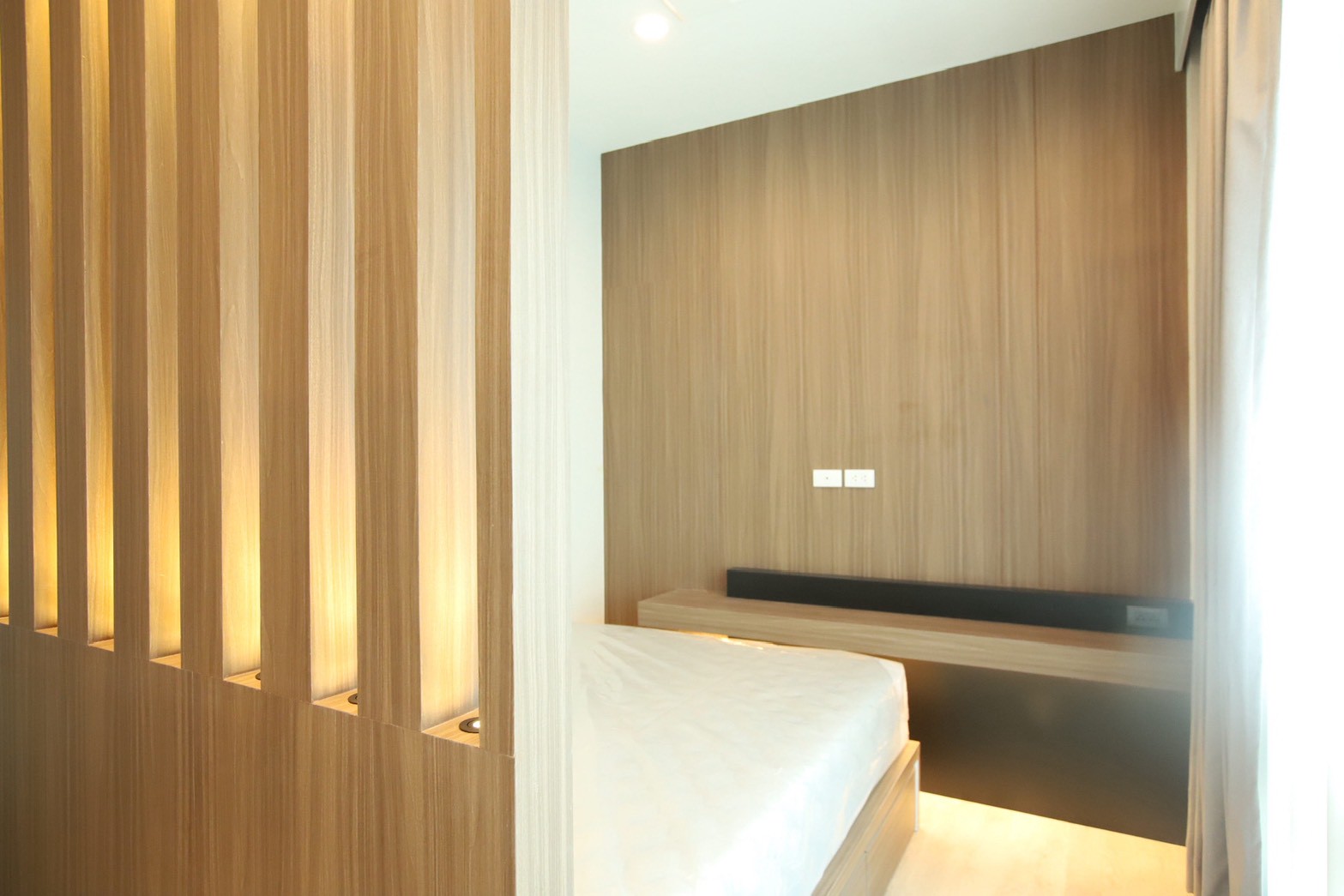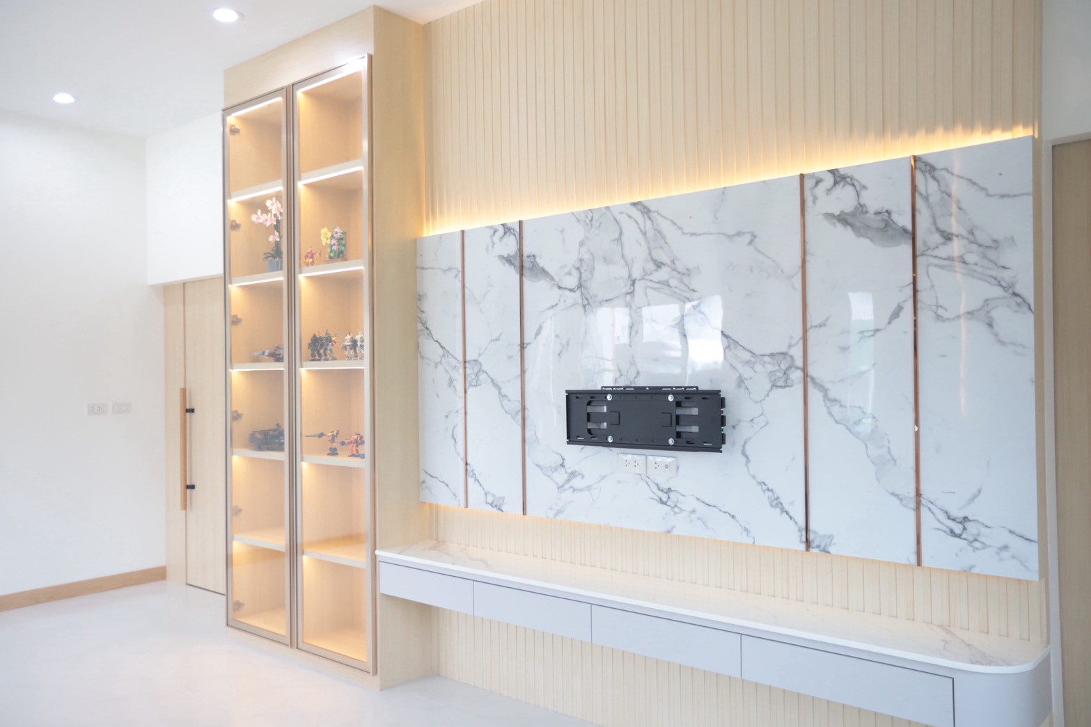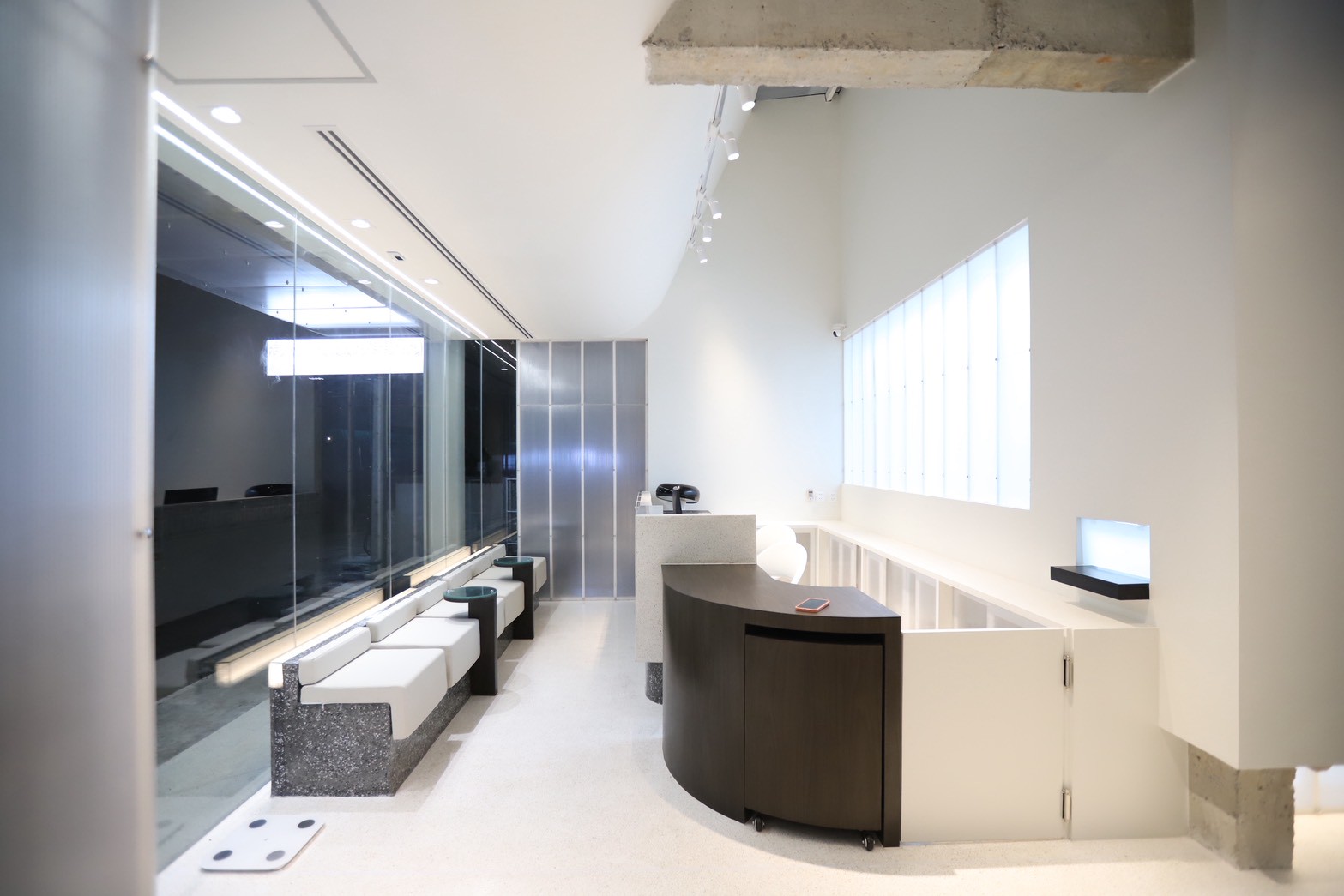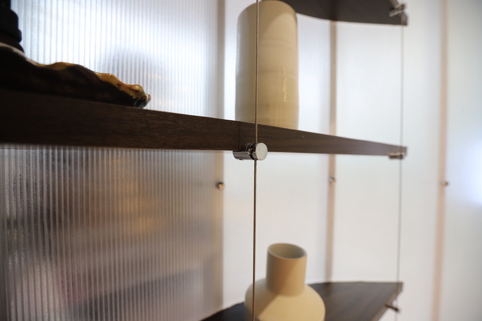 อีกองค์ประกอบเด่นคือผนังที่ใช้ แผ่น Polycarbonate โปร่งแสง ซึ่งถูกออกแบบให้ดัดโค้งเพื่อสร้างเส้นสายที่นุ่มนวลให้กับพื้นที่ ความท้าทายของงานนี้อยู่ที่การทำให้วัสดุสามารถขึ้นรูปโค้งได้อย่างเรียบร้อย แข็งแรง และสอดคล้องกับดีไซน์โดยรวม ทีมงานจึงต้องพัฒนาวิธีการติดตั้งและโครงสร้างรองรับอย่างพิถีพิถัน เพื่อให้ได้ผลลัพธ์ที่ทั้งสวยงามและใช้งานได้จริง