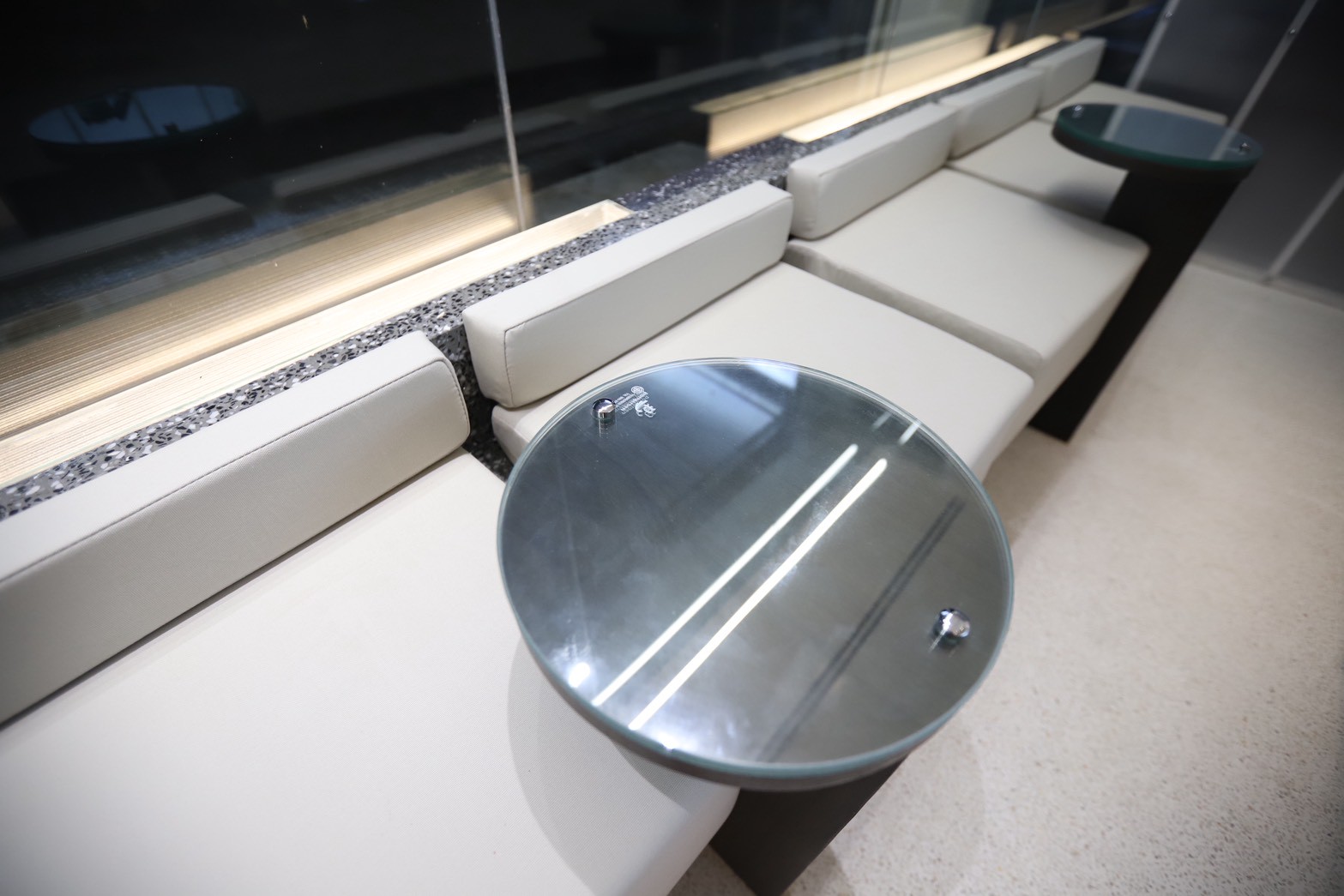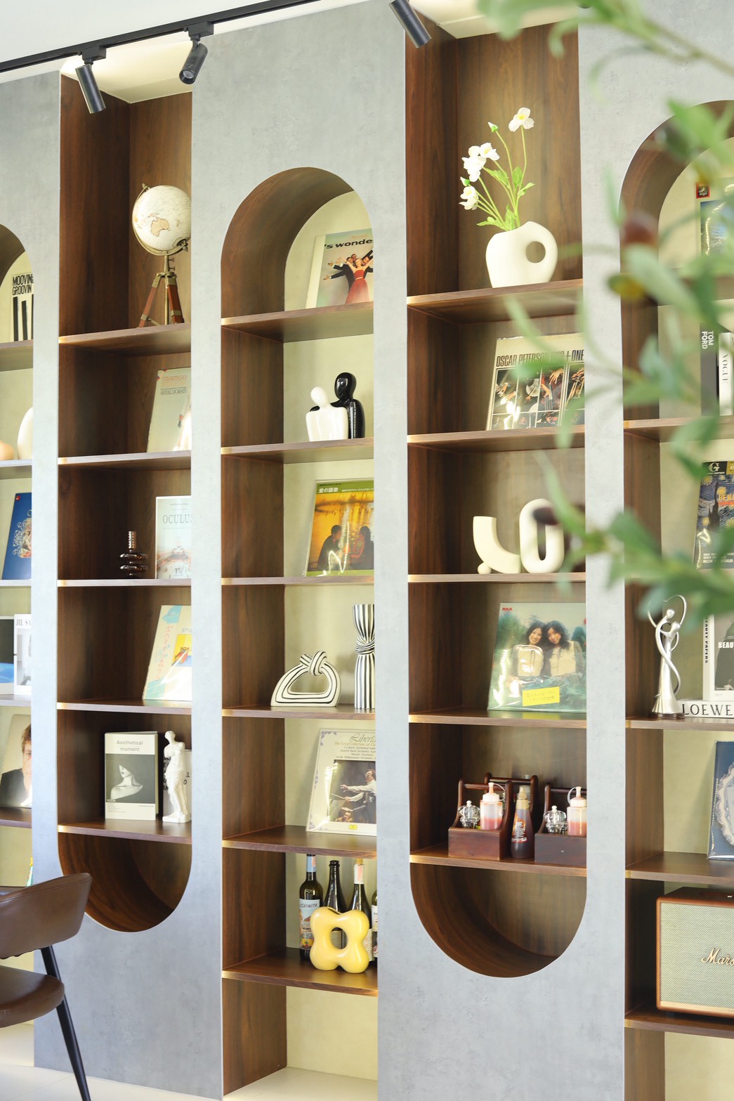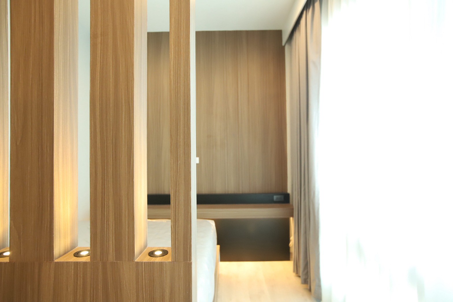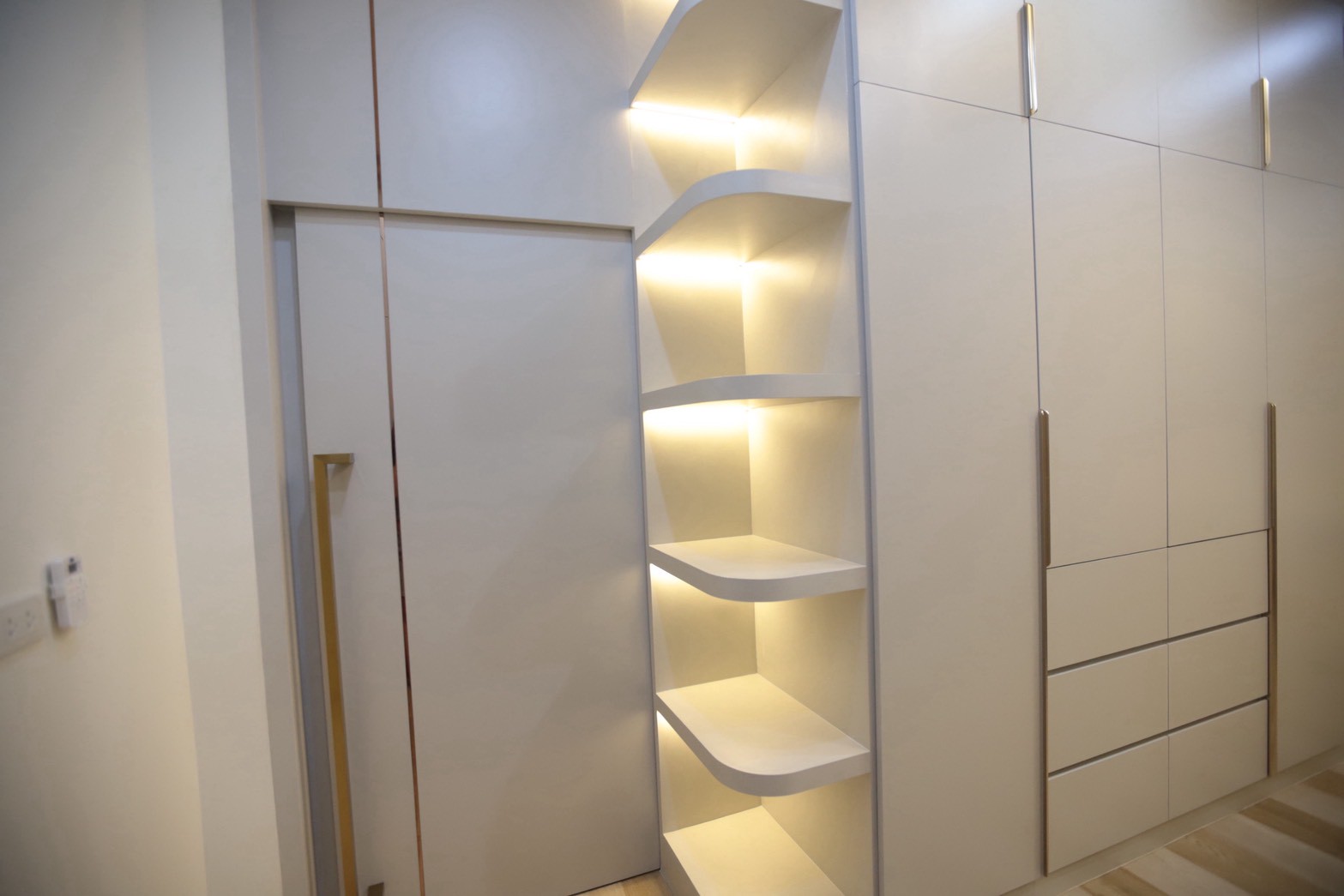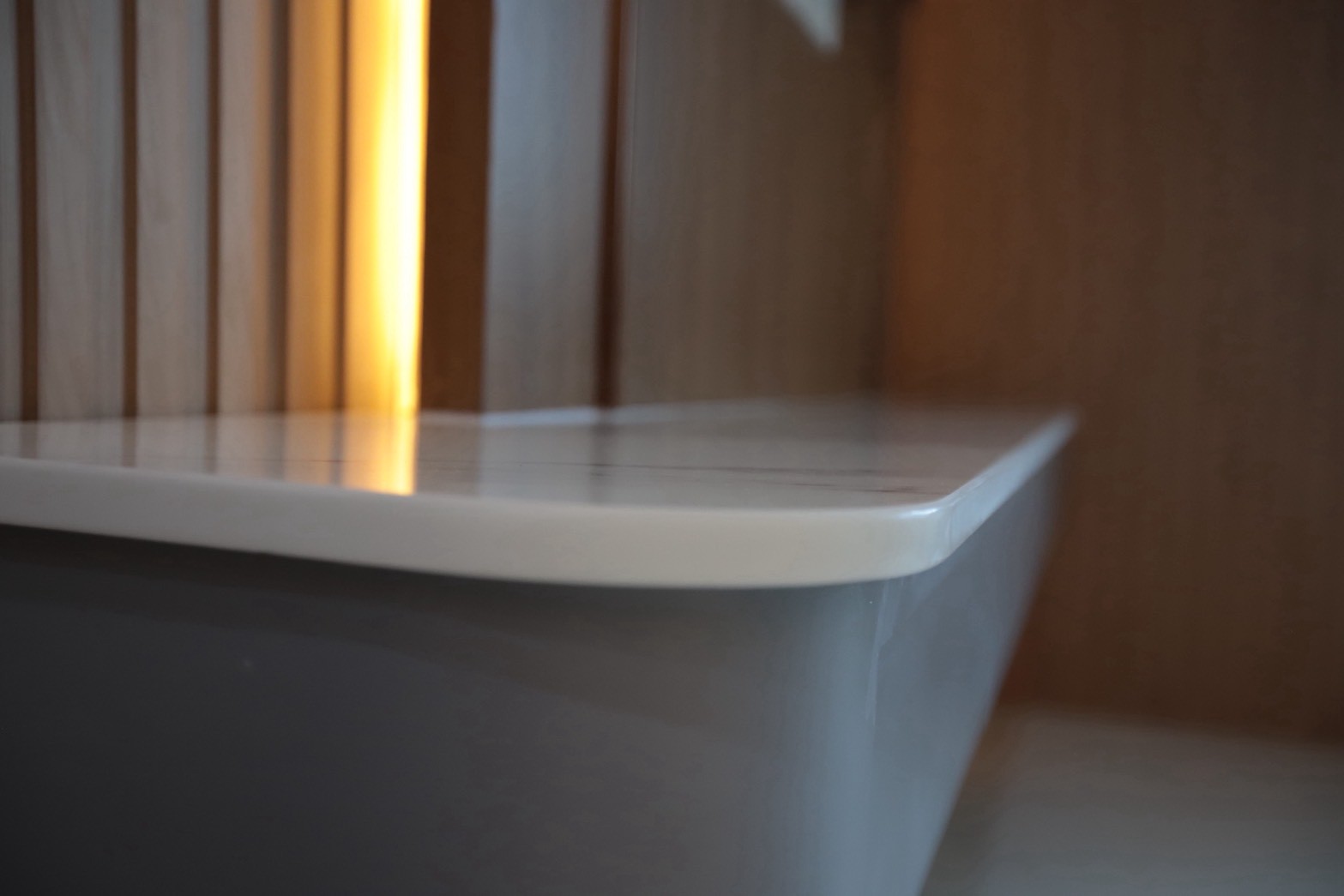 อีกองค์ประกอบเด่นคือผนังที่ใช้ แผ่น Polycarbonate โปร่งแสง ซึ่งถูกออกแบบให้ดัดโค้งเพื่อสร้างเส้นสายที่นุ่มนวลให้กับพื้นที่ ความท้าทายของงานนี้อยู่ที่การทำให้วัสดุสามารถขึ้นรูปโค้งได้อย่างเรียบร้อย แข็งแรง และสอดคล้องกับดีไซน์โดยรวม ทีมงานจึงต้องพัฒนาวิธีการติดตั้งและโครงสร้างรองรับอย่างพิถีพิถัน เพื่อให้ได้ผลลัพธ์ที่ทั้งสวยงามและใช้งานได้จริง