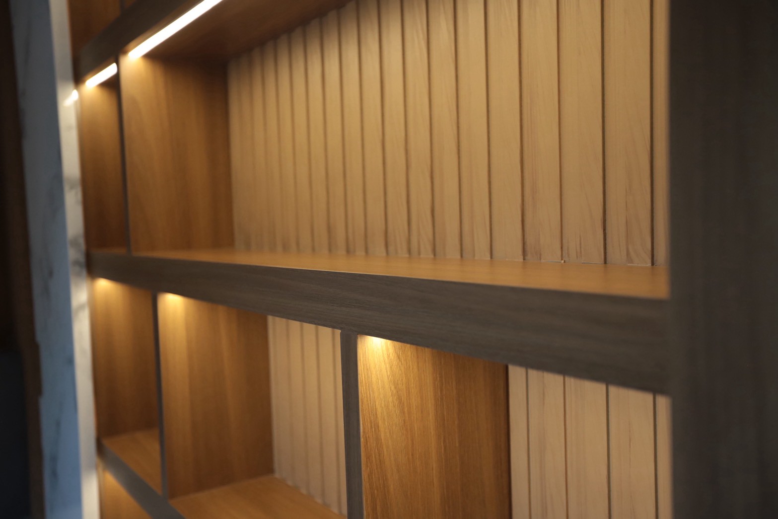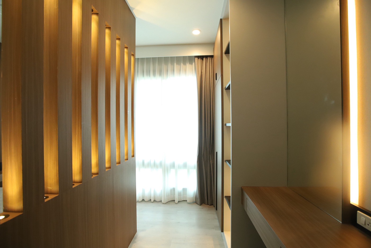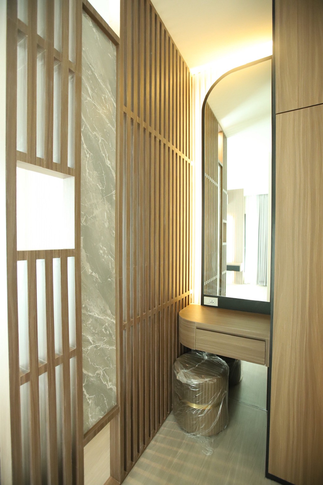วัสดุปิดผิวหลักเลือกใช้ ลามิเนทลายไม้ ตัดกับ ลามิเนทสีเทาอ่อน เพื่อสร้างสมดุลระหว่างความอบอุ่นและความเรียบหรู พร้อมเพิ่มรายละเอียดด้วย สเตนเลสสีทอง ในบางจุดเพื่อเสริมมิติของงานตกแต่งภายใน