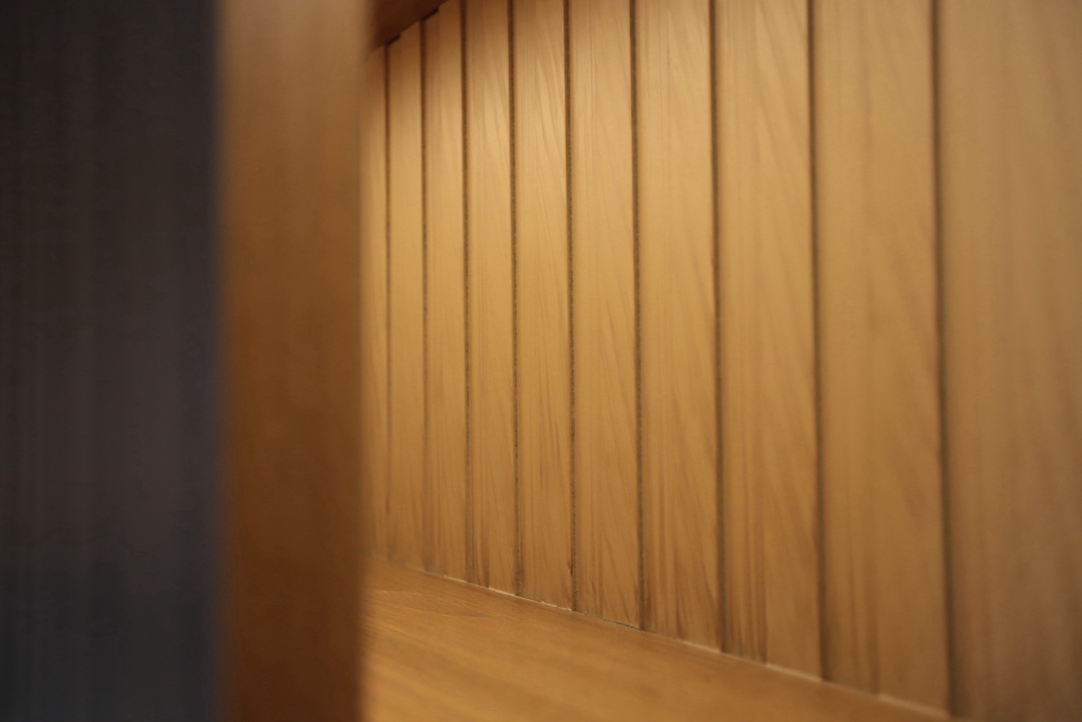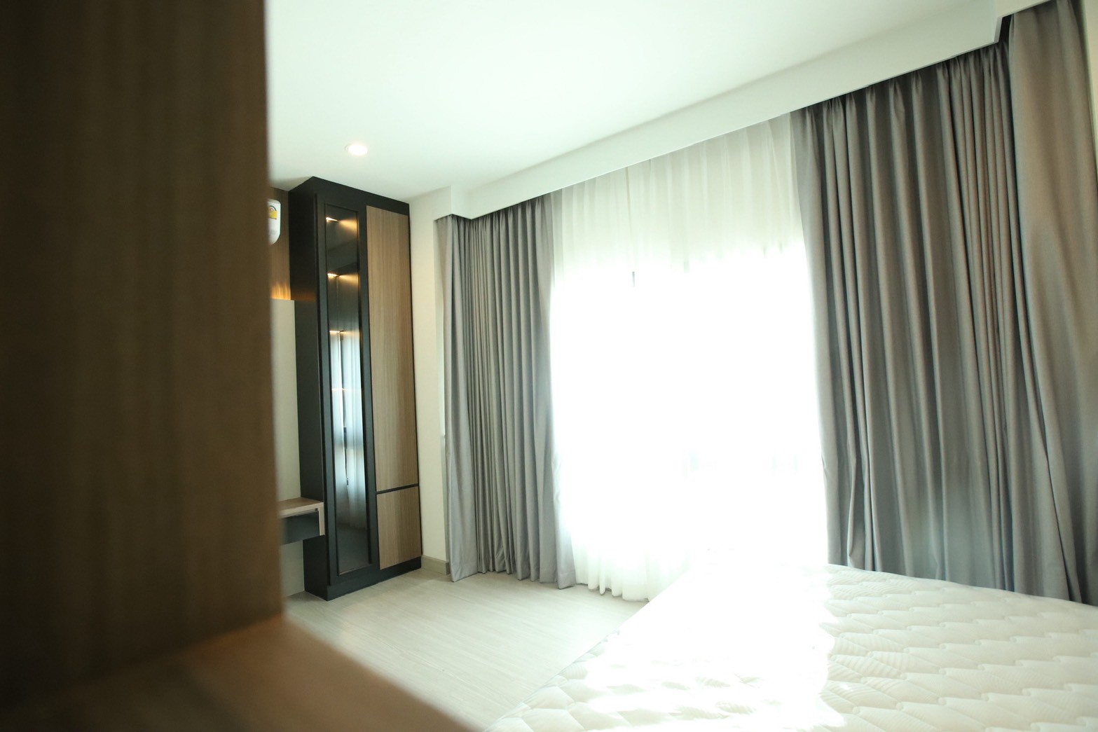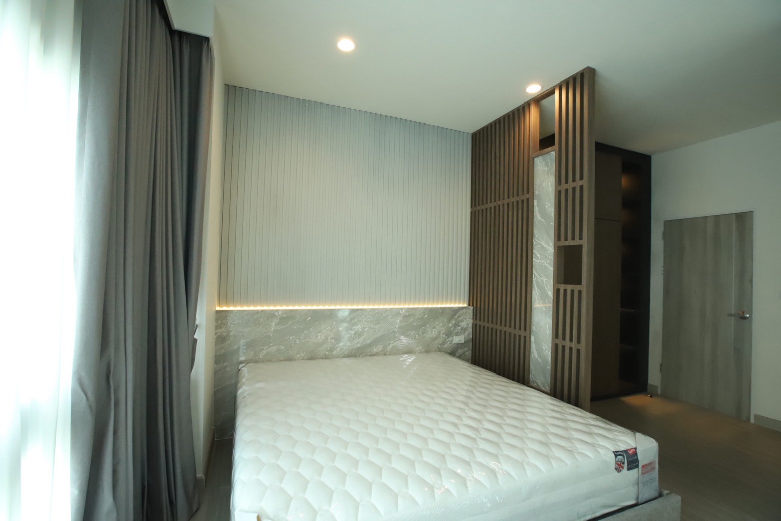 วัสดุปิดผิวหลักเลือกใช้ ลามิเนทลายไม้ ตัดกับ ลามิเนทสีเทาอ่อน เพื่อสร้างสมดุลระหว่างความอบอุ่นและความเรียบหรู พร้อมเพิ่มรายละเอียดด้วย สเตนเลสสีทอง ในบางจุดเพื่อเสริมมิติของงานตกแต่งภายใน