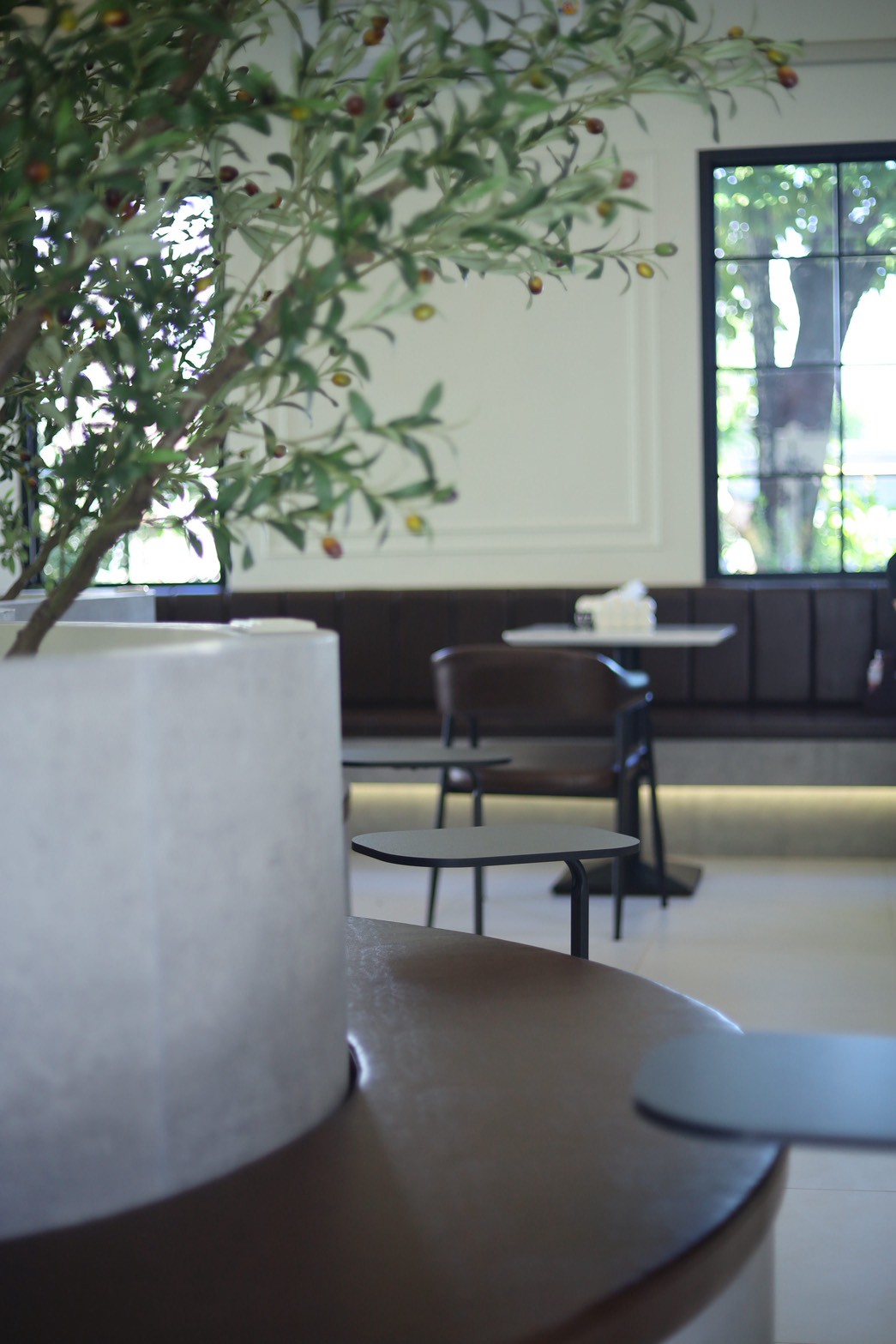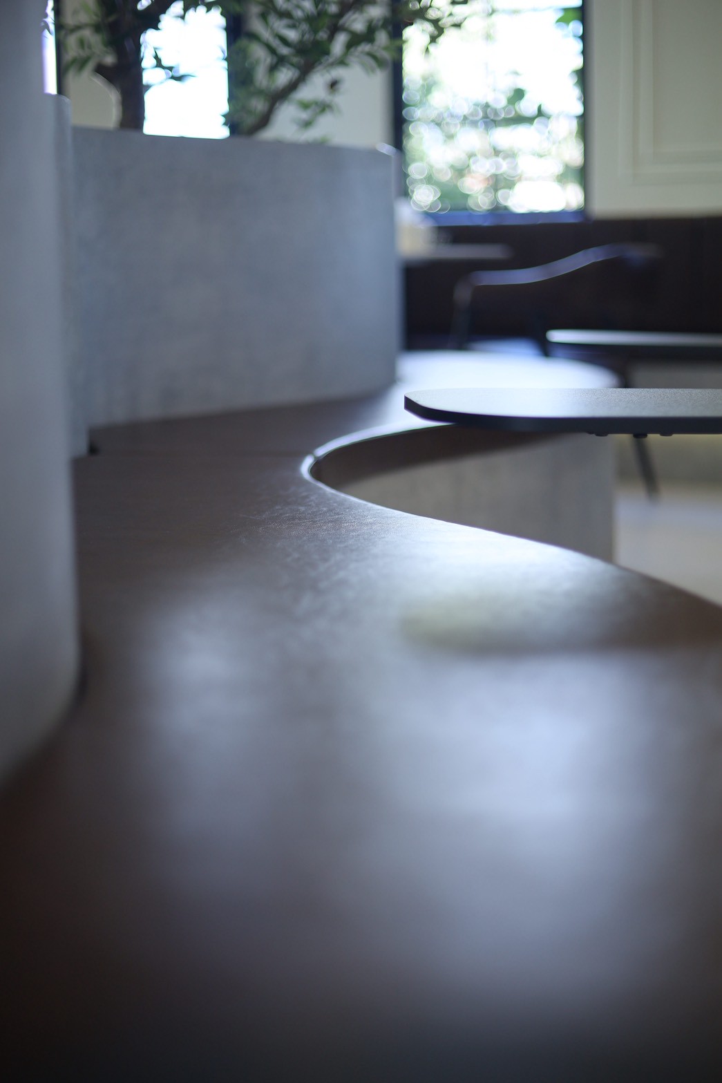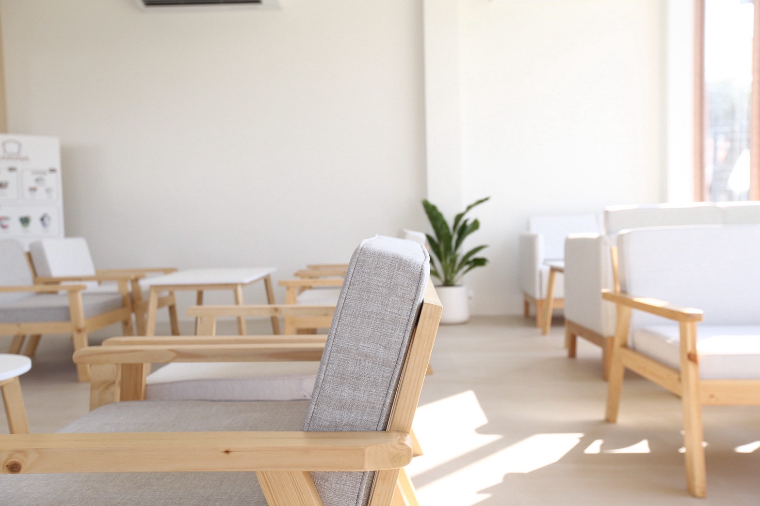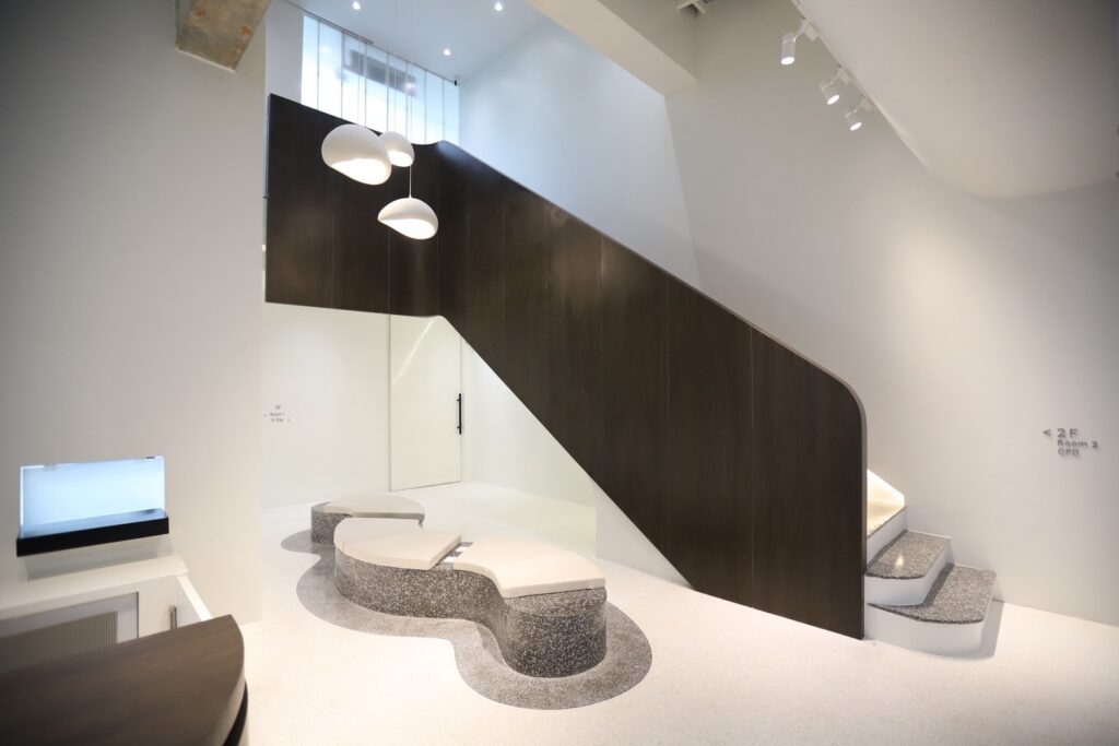 เพื่อเพิ่มมิติให้กับงานออกแบบ เฟอร์นิเจอร์ลอยตัวถูกเลือกใช้ในโทน ผ้าสีเทา ซึ่งช่วยสร้างความสมดุลระหว่างความอบอุ่นของไม้กับความโมเดิร์นของวัสดุโดยรอบ ทำให้ภาพรวมของร้านดูนุ่มนวลและน่าใช้งานมากขึ้น