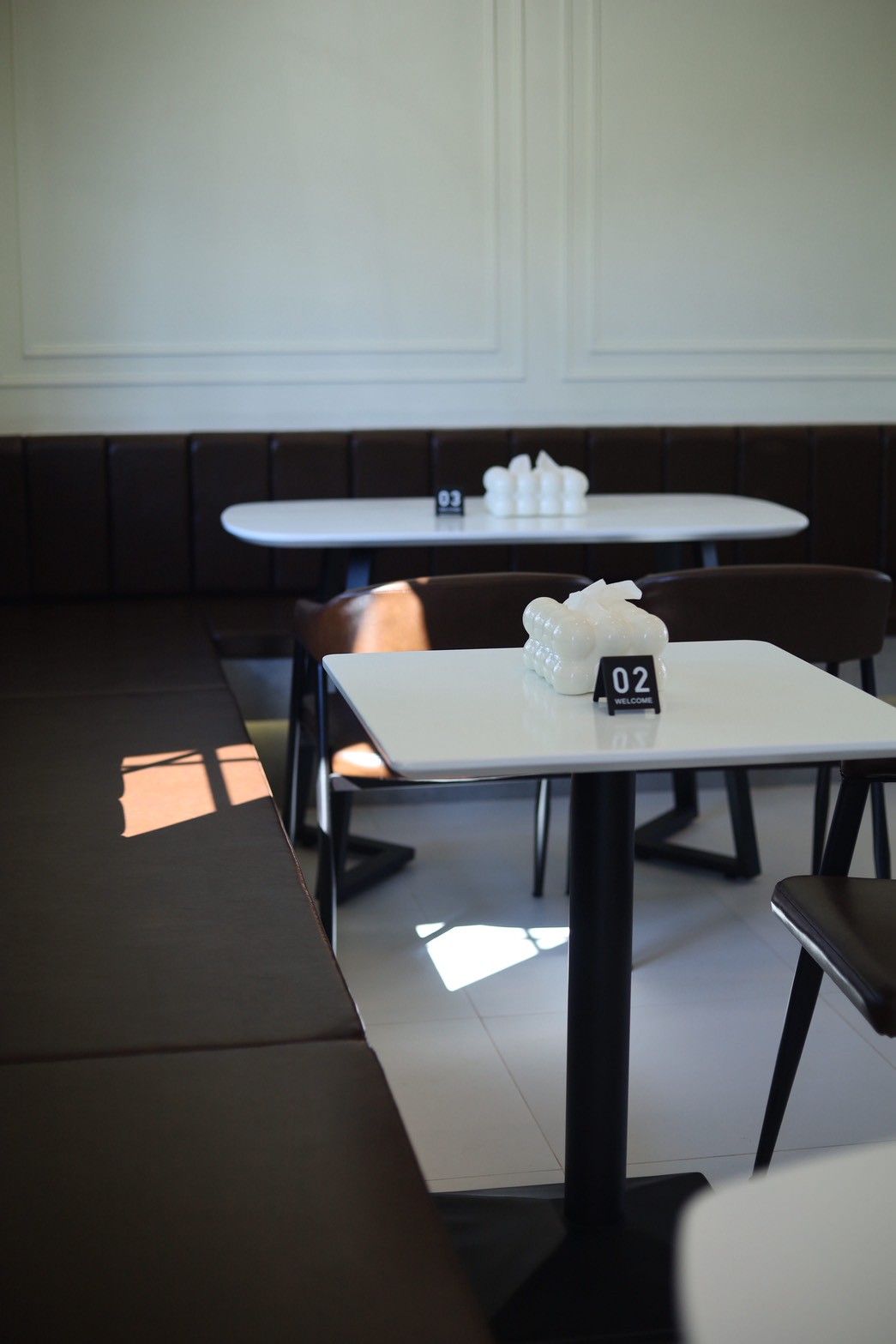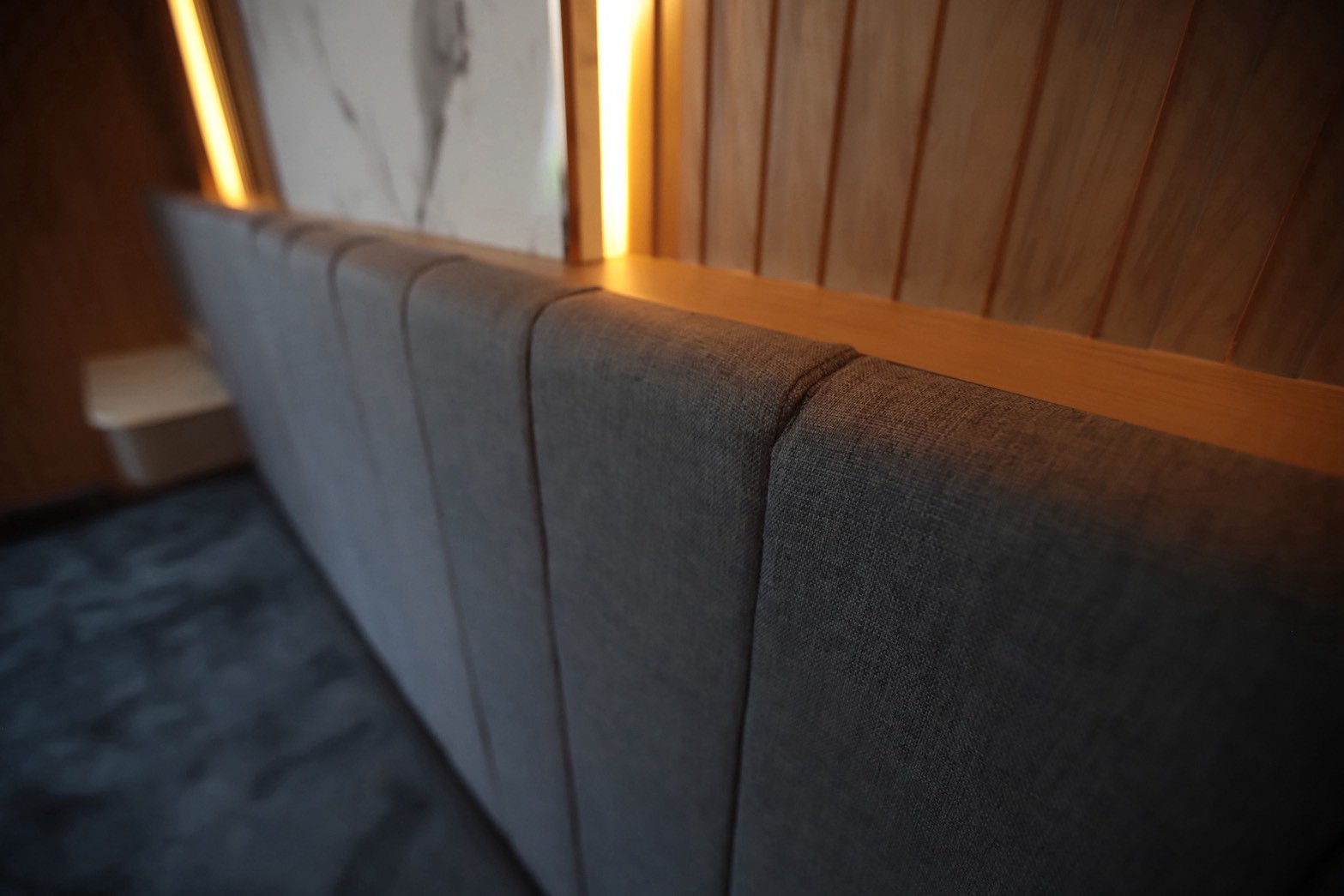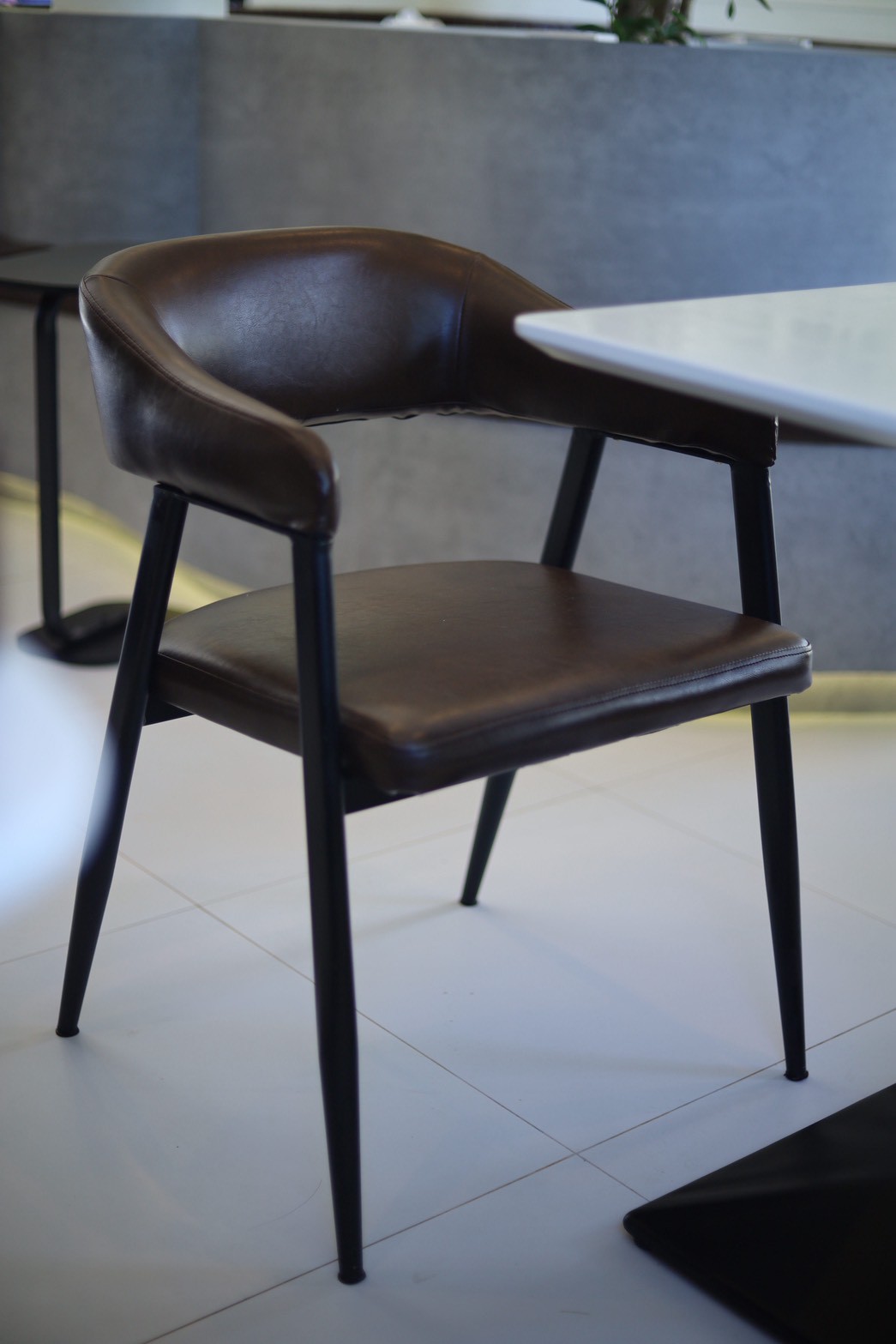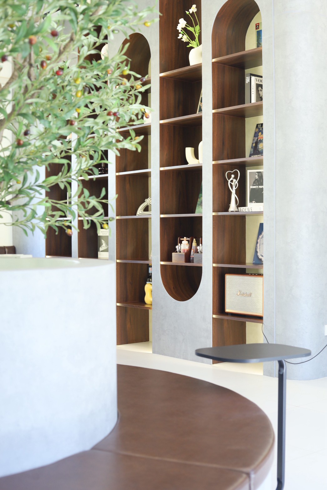 เพื่อเพิ่มมิติให้กับงานออกแบบ เฟอร์นิเจอร์ลอยตัวถูกเลือกใช้ในโทน ผ้าสีเทา ซึ่งช่วยสร้างความสมดุลระหว่างความอบอุ่นของไม้กับความโมเดิร์นของวัสดุโดยรอบ ทำให้ภาพรวมของร้านดูนุ่มนวลและน่าใช้งานมากขึ้น