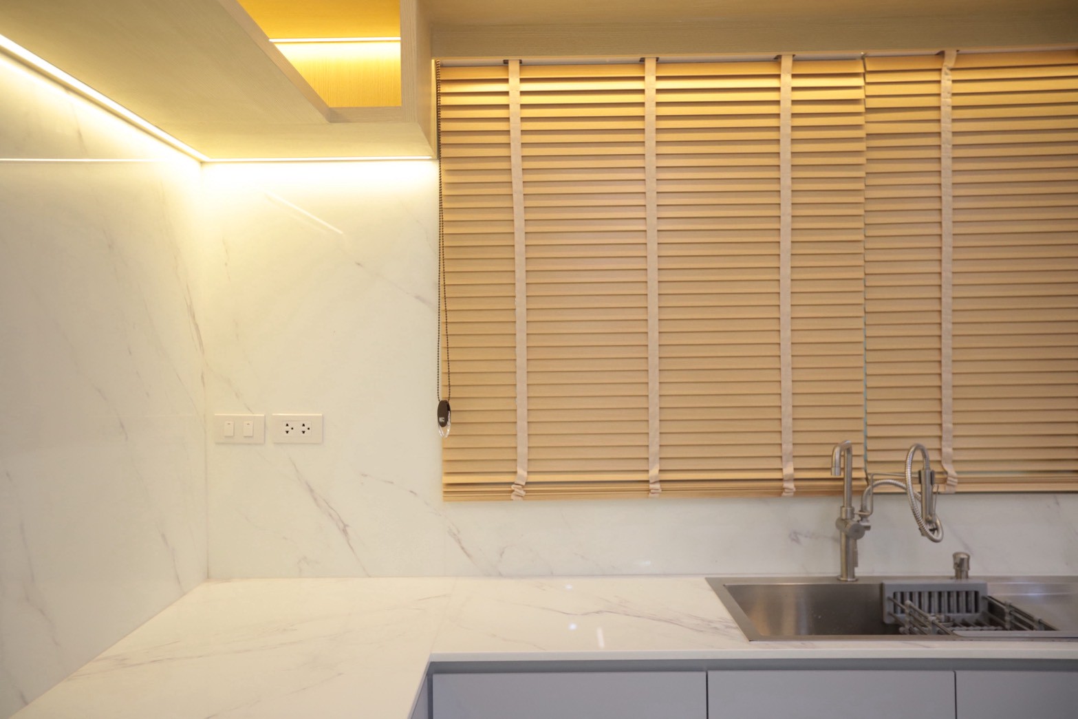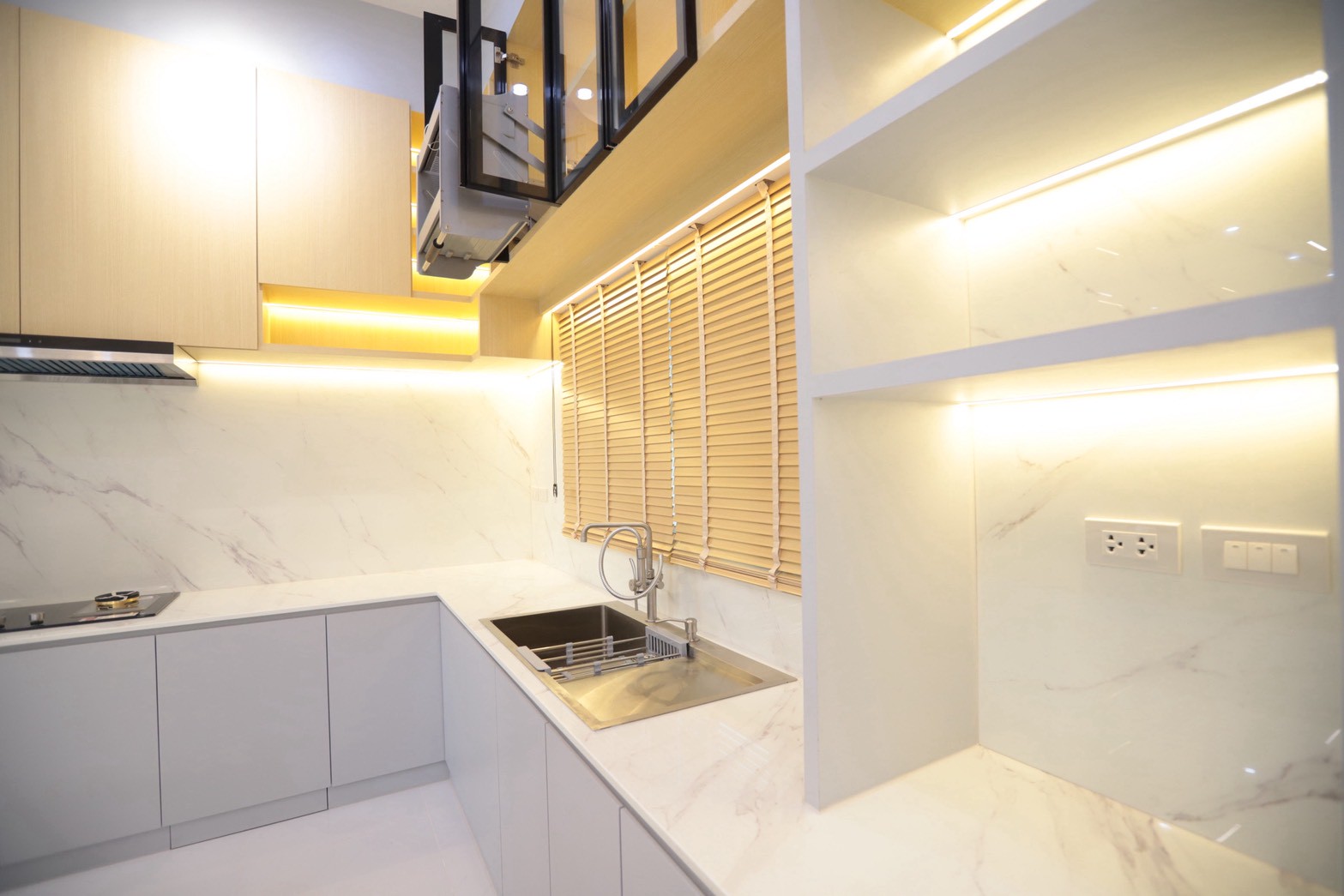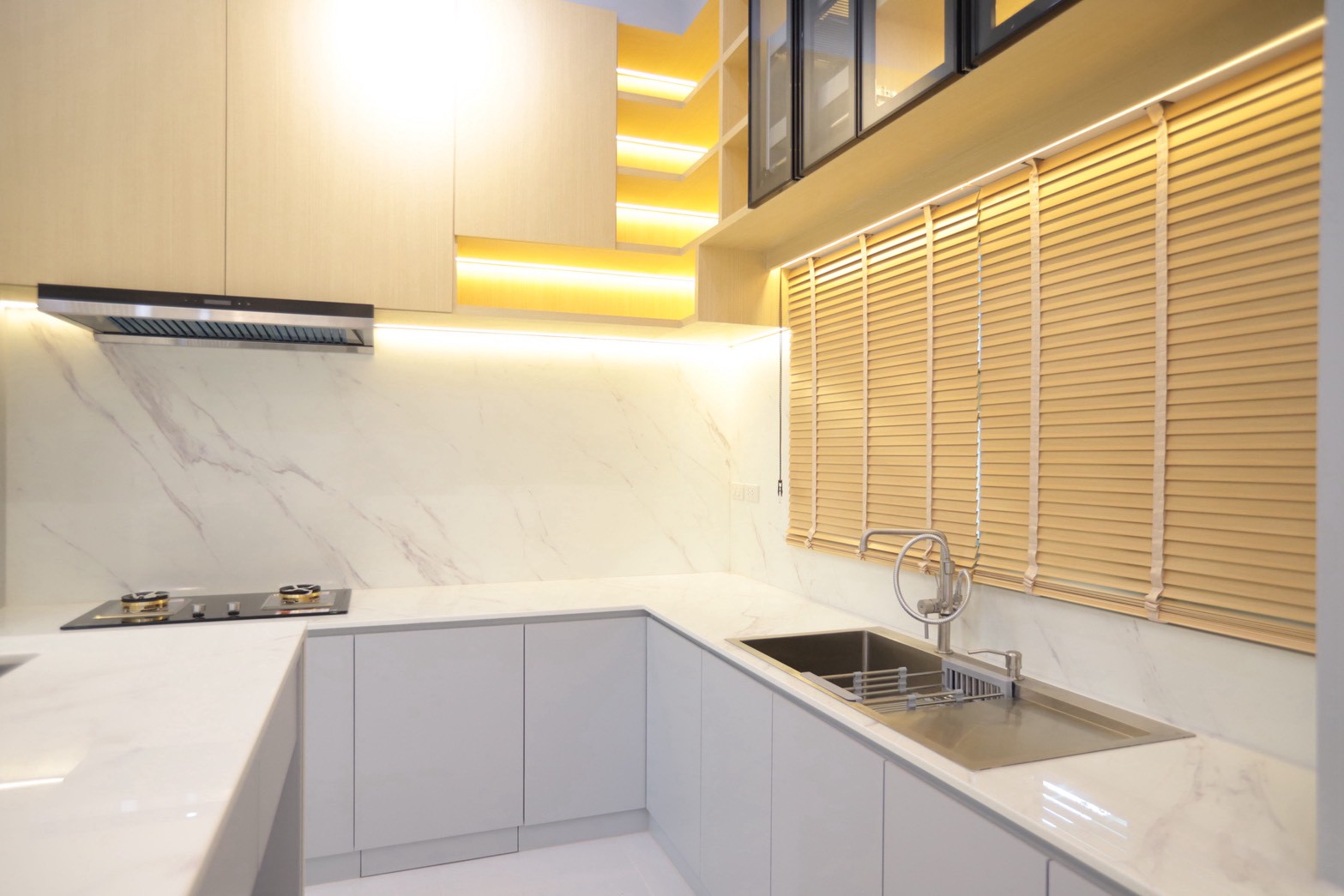 ในส่วนของห้องครัว ใช้ ท็อปหินอ่อน White Venus ที่มีลายเส้นสีเทาอย่างพอดี ช่วยให้เข้ากับโทนวัสดุโดยรวม พร้อมคงความสะอาดตาและความหรูหราอย่างพอดี