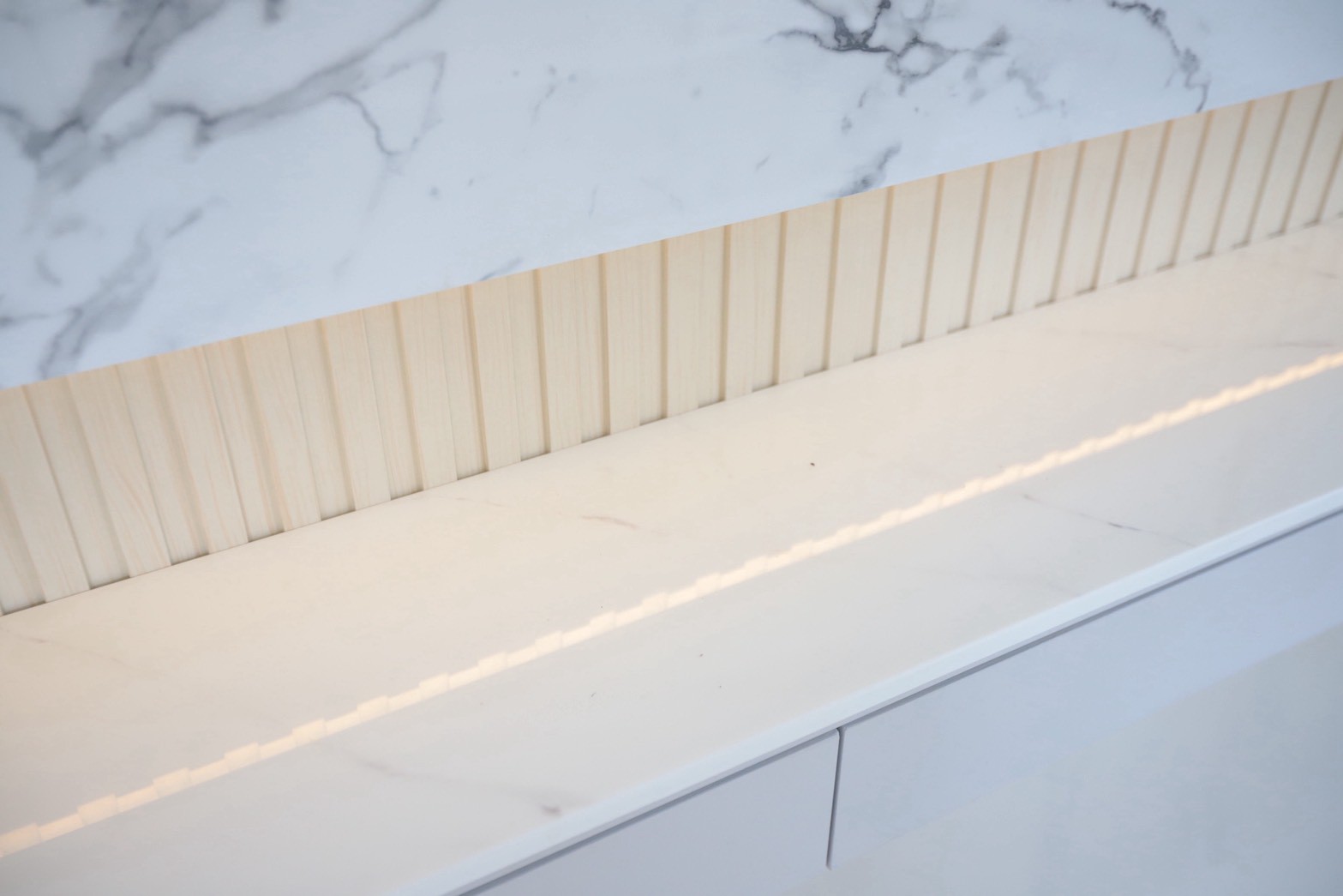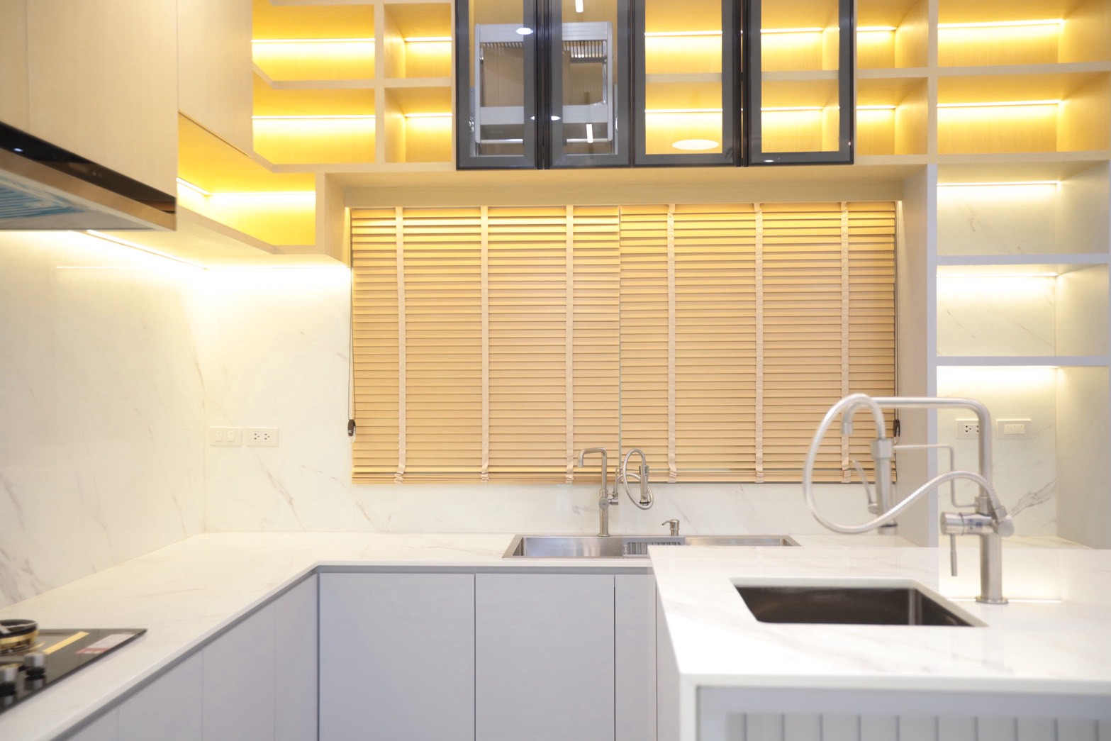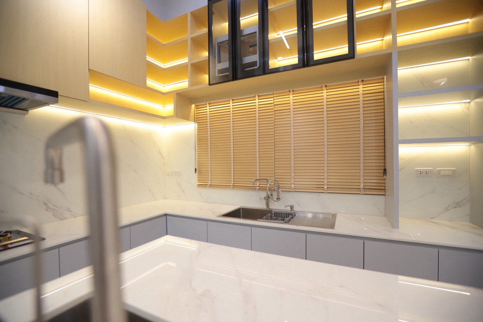 ในส่วนของห้องครัว ใช้ ท็อปหินอ่อน White Venus ที่มีลายเส้นสีเทาอย่างพอดี ช่วยให้เข้ากับโทนวัสดุโดยรวม พร้อมคงความสะอาดตาและความหรูหราอย่างพอดี