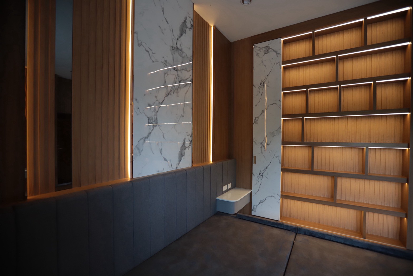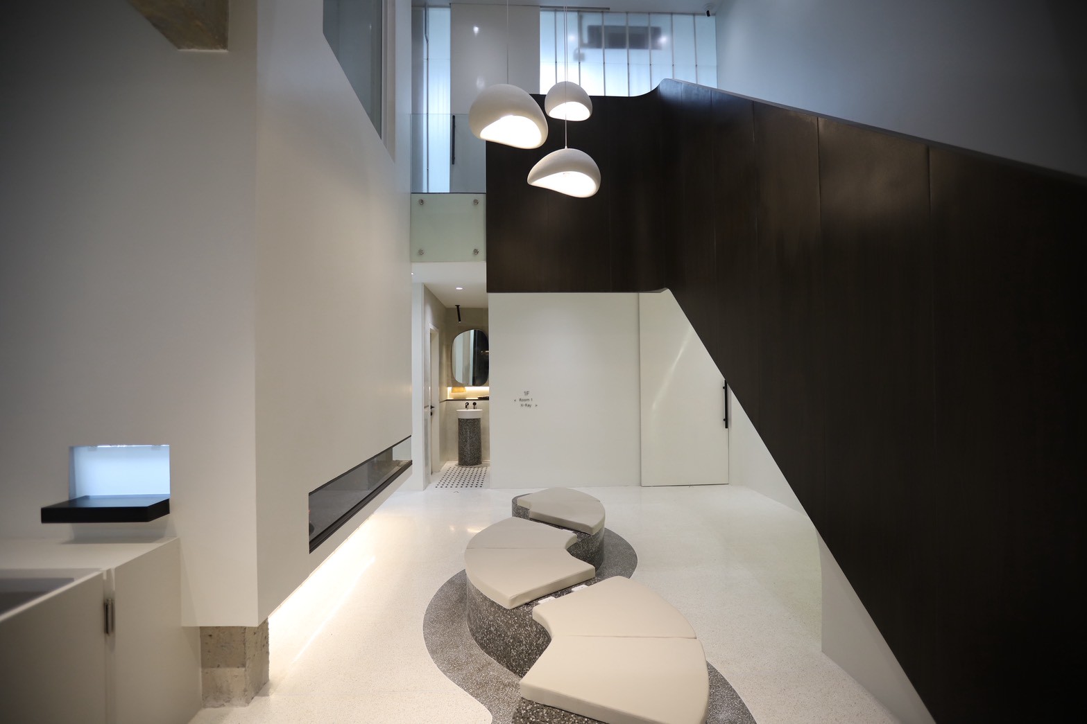 หนึ่งในไฮไลต์สำคัญของโครงการคือการออกแบบพื้นห้อง ด้วยการใช้ หินอ่อน Black Marquina ตัดเป็นชิ้นขนาดประมาณ 5 x 1 เซนติเมตร แล้วนำไปฝังลงบนพื้น Terrazzo ซึ่งเป็นกระบวนการที่ต้องอาศัยความแม่นยำและความชำนาญของทีมช่างอย่างมาก เพื่อให้ลวดลายของพื้นออกมาสม่ำเสมอและกลมกลืนกับภาพรวมของงานออกแบบ