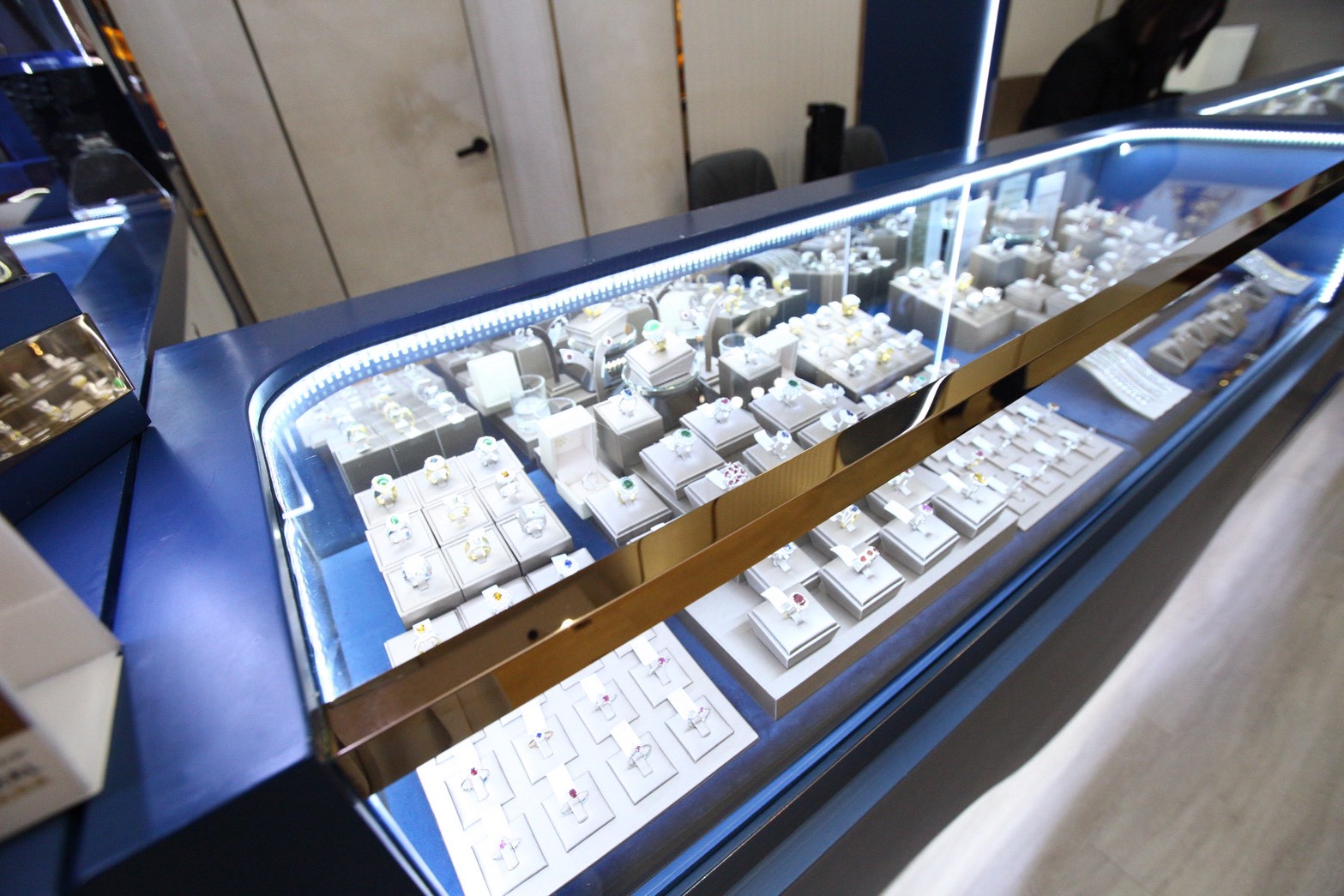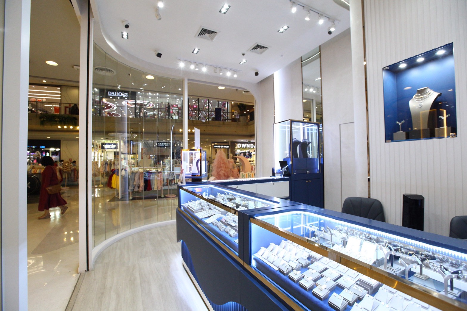 ในด้านการออกแบบ ร้านถูกพัฒนาภายใต้ข้อจำกัดของทั้งพื้นที่และงบประมาณ โดยเลือกใช้ งานพ่นสี เป็นวัสดุหลัก ผสมผสานกับ งานสเตนเลส เพื่อเพิ่มความรู้สึกหรูหราและสะท้อนภาพลักษณ์ของร้านเครื่องประดับ ขณะเดียวกันยังคงเน้นความเรียบง่าย เพื่อไม่ให้การตกแต่งภายในดึงความโดดเด่นออกจาก เพชรและเครื่องประดับ ซึ่งเป็นสินค้าหลักของร้าน